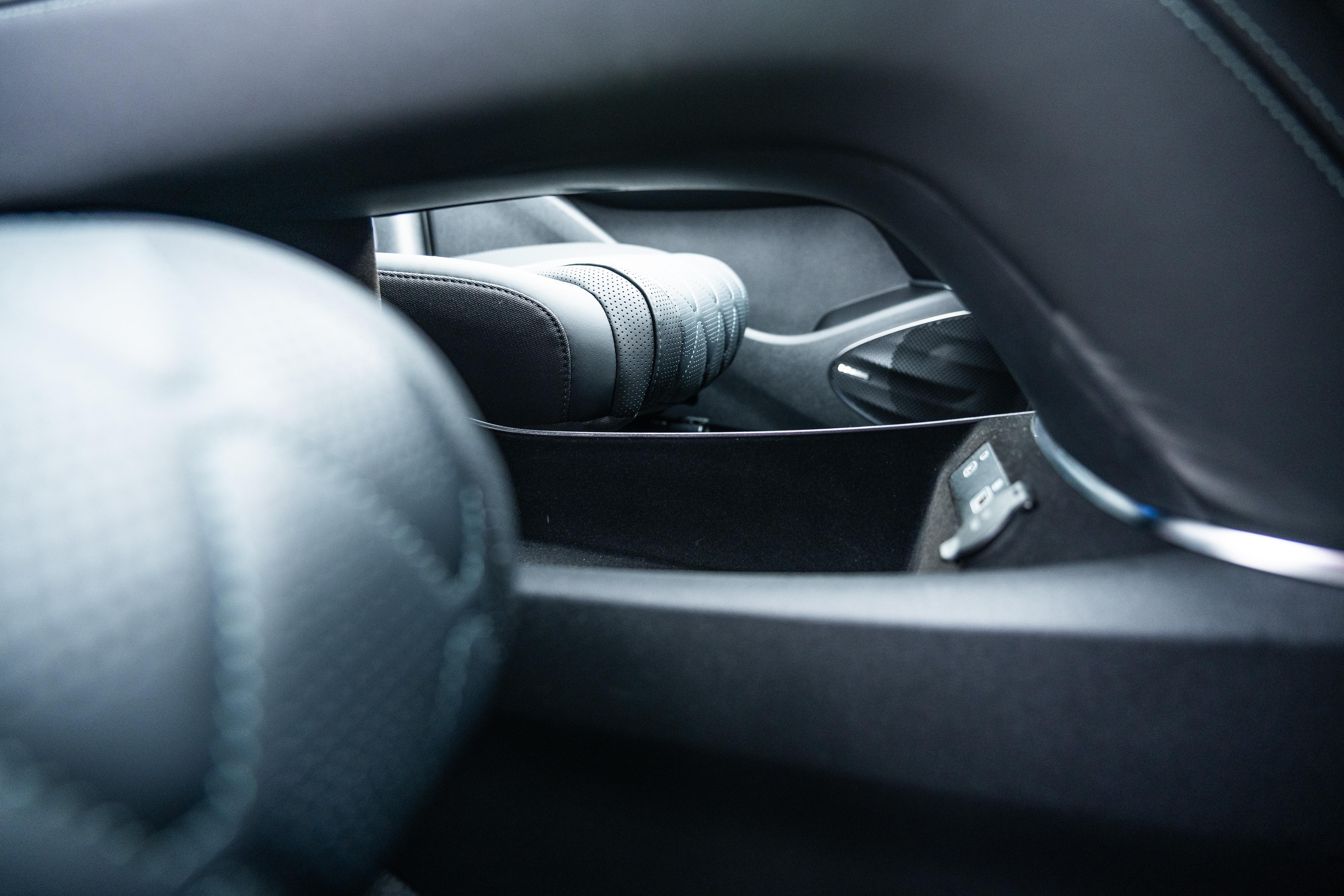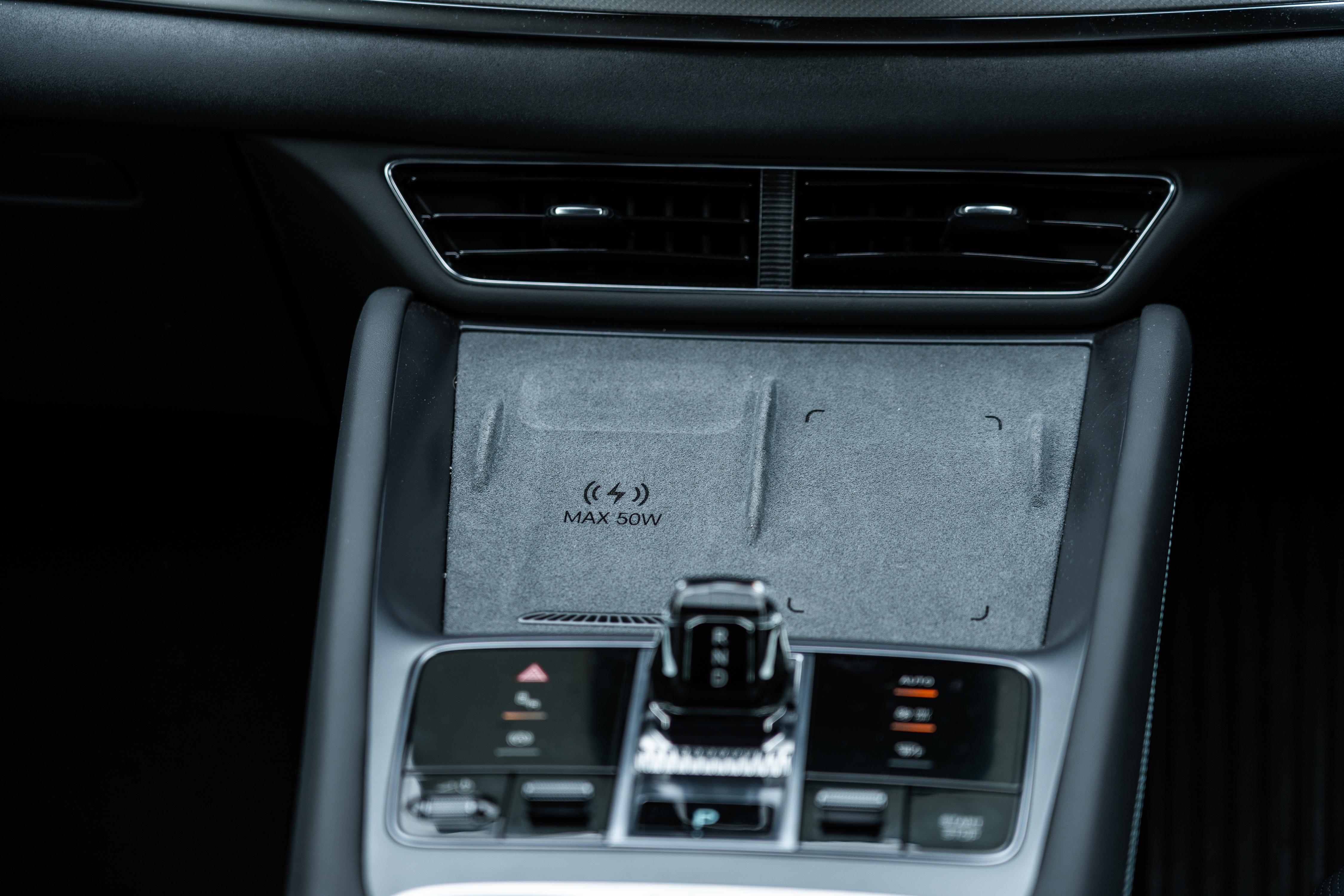 I also appreciate the Tesla-style dual felt-lined phone holders ahead of the shifter, with one doubling up as a wireless phone charger with a cooling vent to prevent overheating.