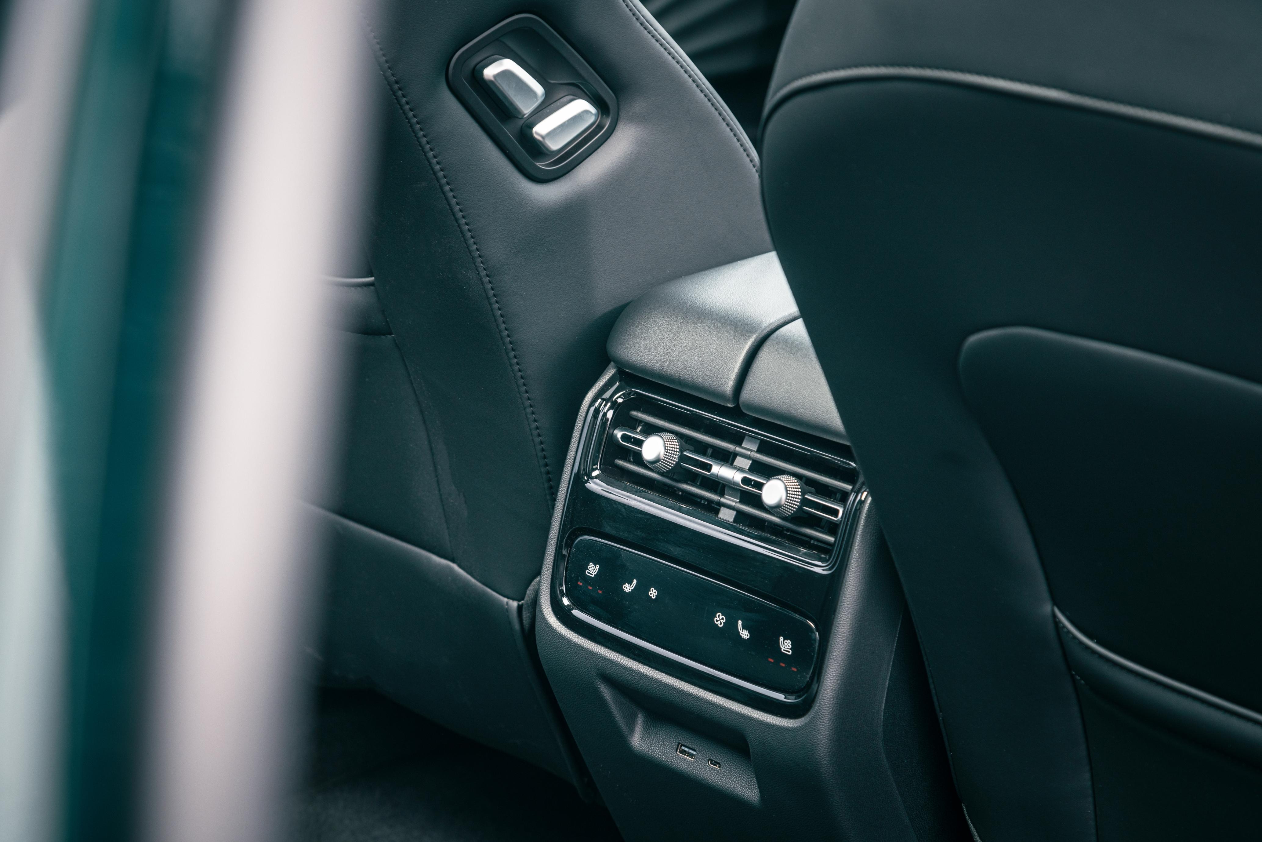 The centre console section is defined by a chrome ring that surrounds the middle air vents, with matching highlights around the cupholders and the bank of physical controls next to them, which includes a rotary dial for the multi-mode drive settings, electric handbrake, windscreen demisters and one-touch buttons to activate hybrid or full EV modes.