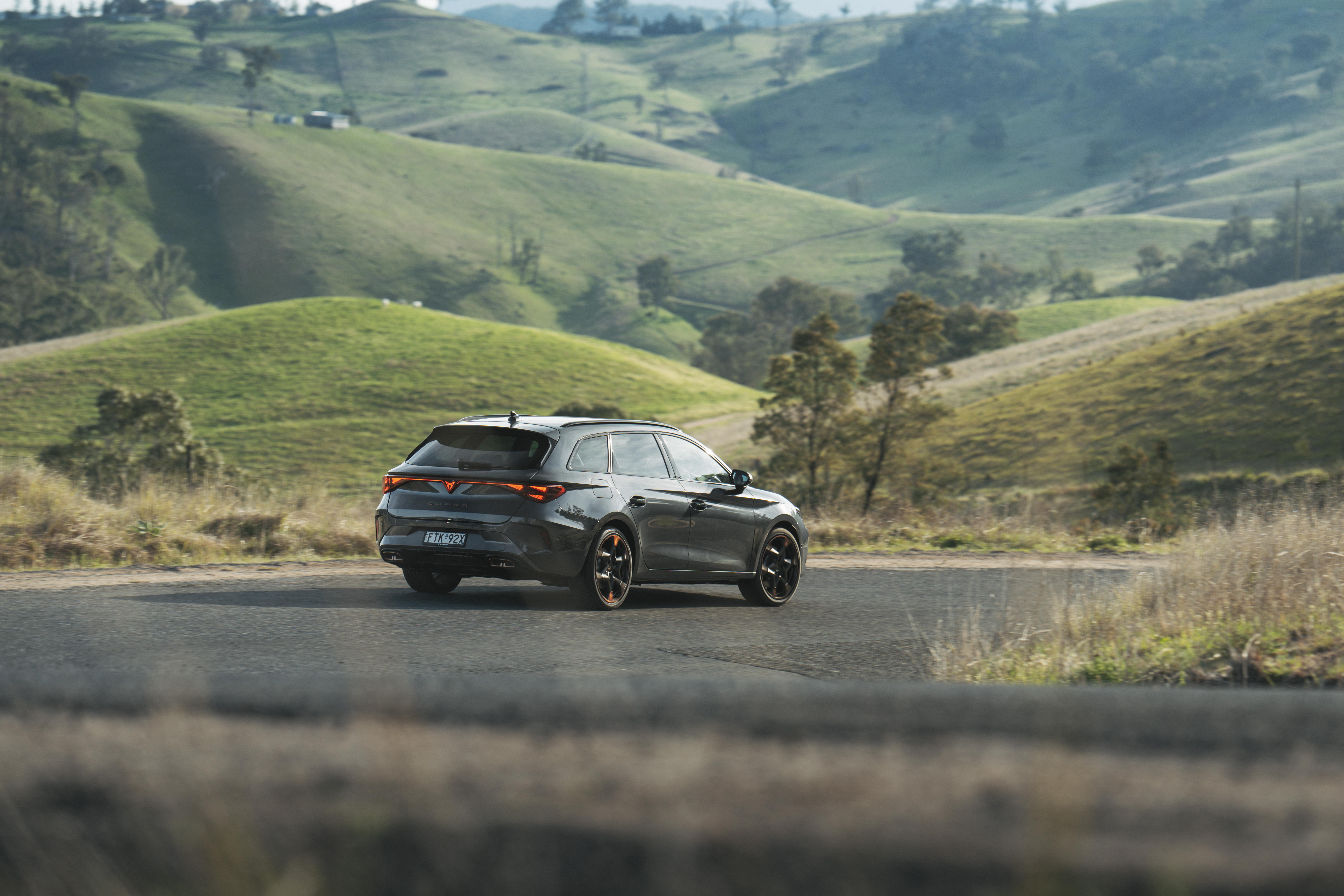 You’ll often find the wagon’s beefy outputs can overwhelm the front wheels if you plant it hard, spinning them even once you’re rolling. In Performance and Cupra modes there’s a fake engine sound that almost sounds like a V8 at full noise – while I’m normally not one for synthesised engine notes, this one actually makes you smile.