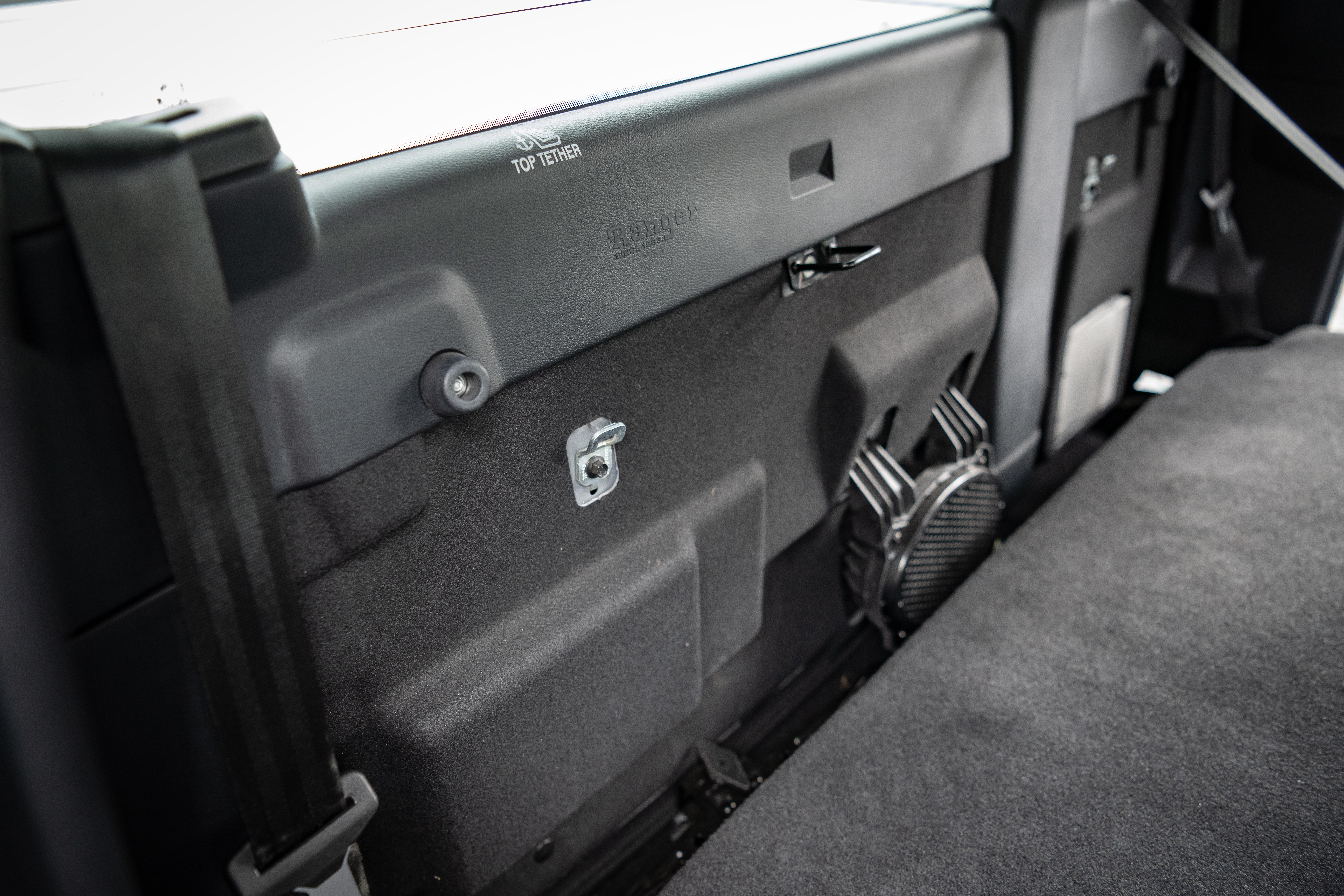 If you need extra cargo space and don’t want to use the tub, the rear bench can either fold up or down to accommodate. Folding it up reveals a couple of cubbies in the floor, while folding down reveals a plastic-lined bulkhead with an Easter egg: the original Ranger logo.