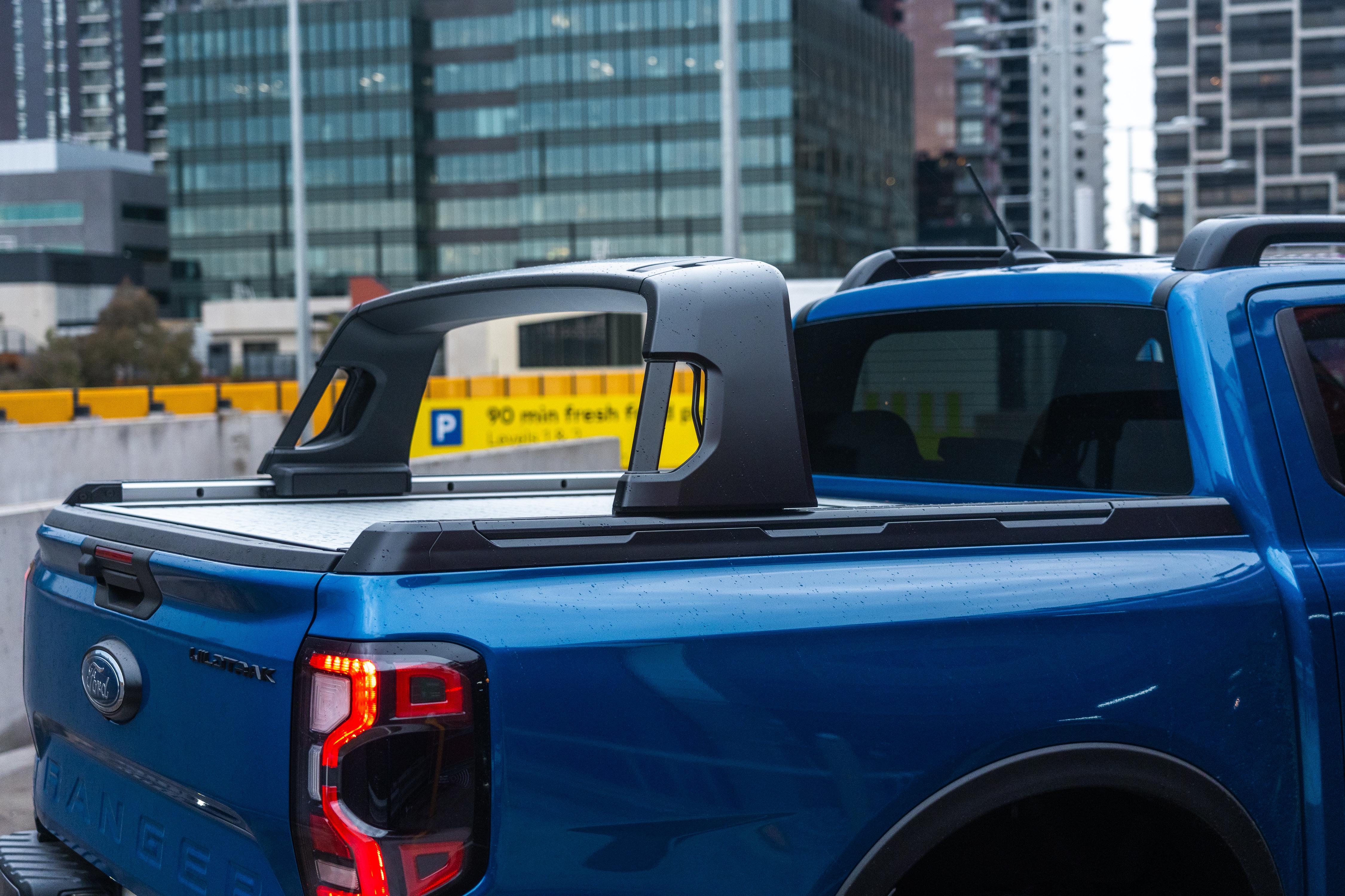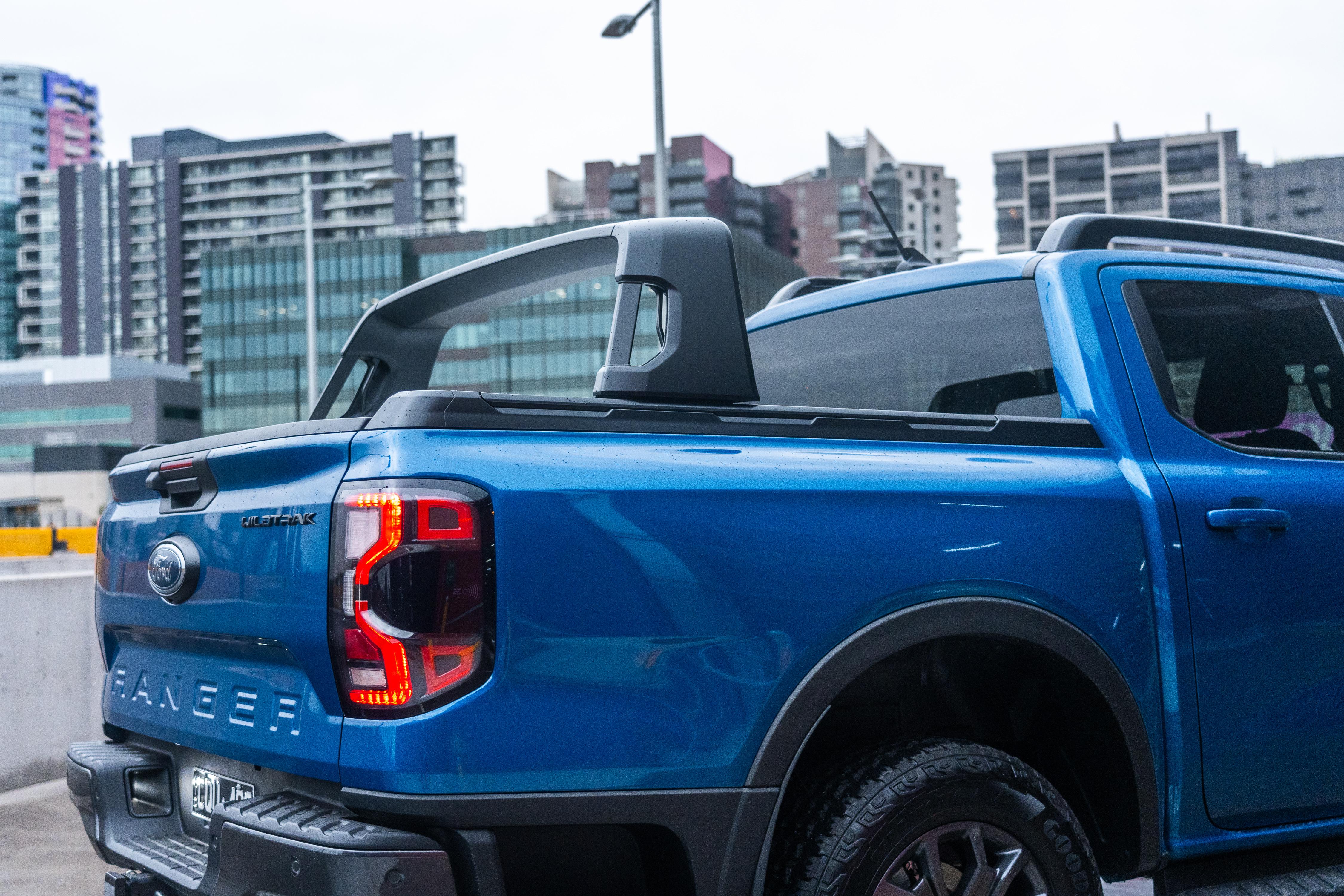 You’ll also notice our blue tester was fitted with Ford’s optional Flexible Rack System, which costs $2800 extra. Replacing the Wildtrak’s standard Sports Sailplane, it’s a sleek unit that can slide into various positions atop the bed, giving you an additional point to secure long items to the roof that wouldn’t otherwise fit.