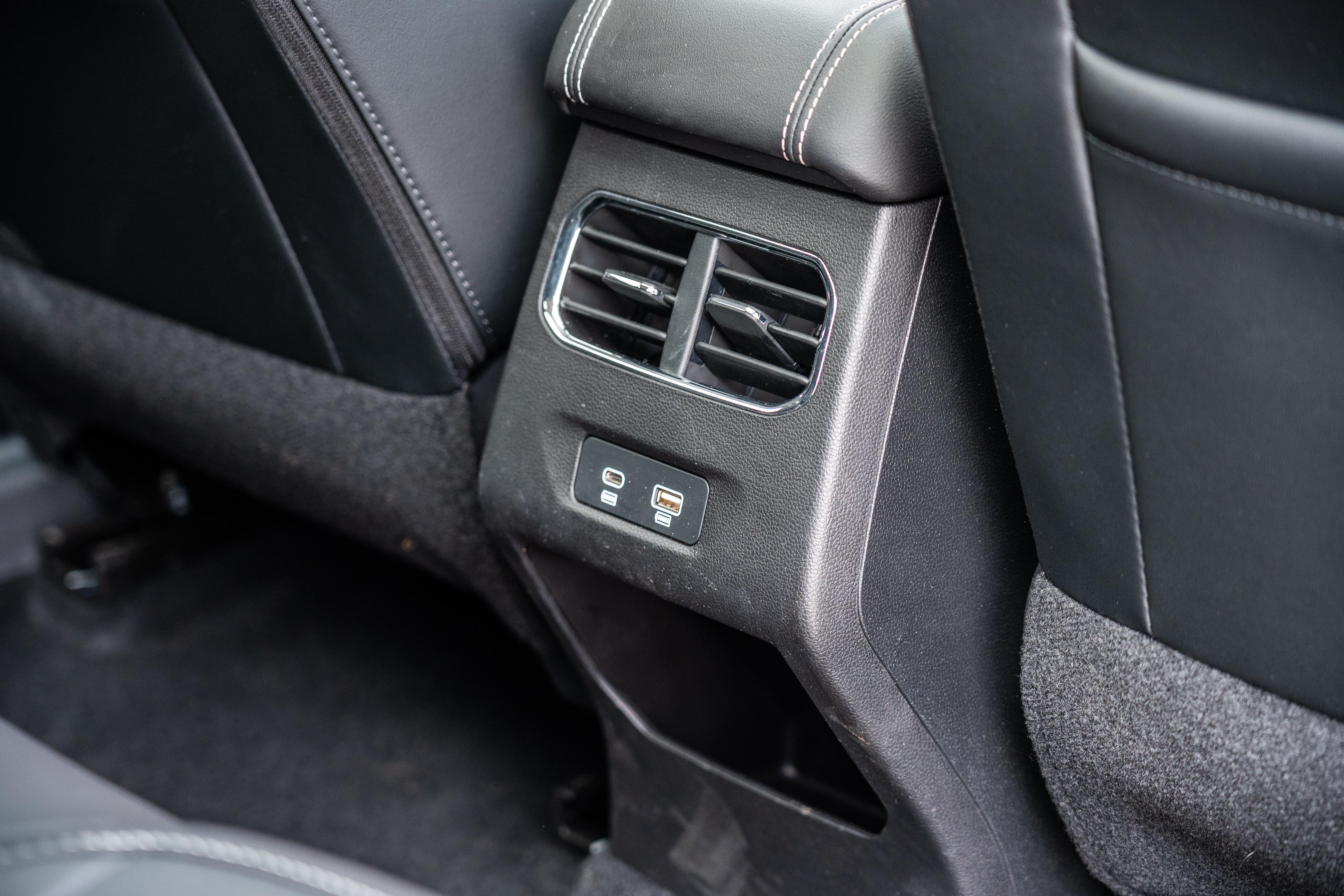 The second row isn’t flashy, but it’s appointed well enough to keep passengers comfortable. Fitted as standard are two air vents and USB-A and -C ports on the back of the centre console, albeit with a lot of scratchy black plastic.