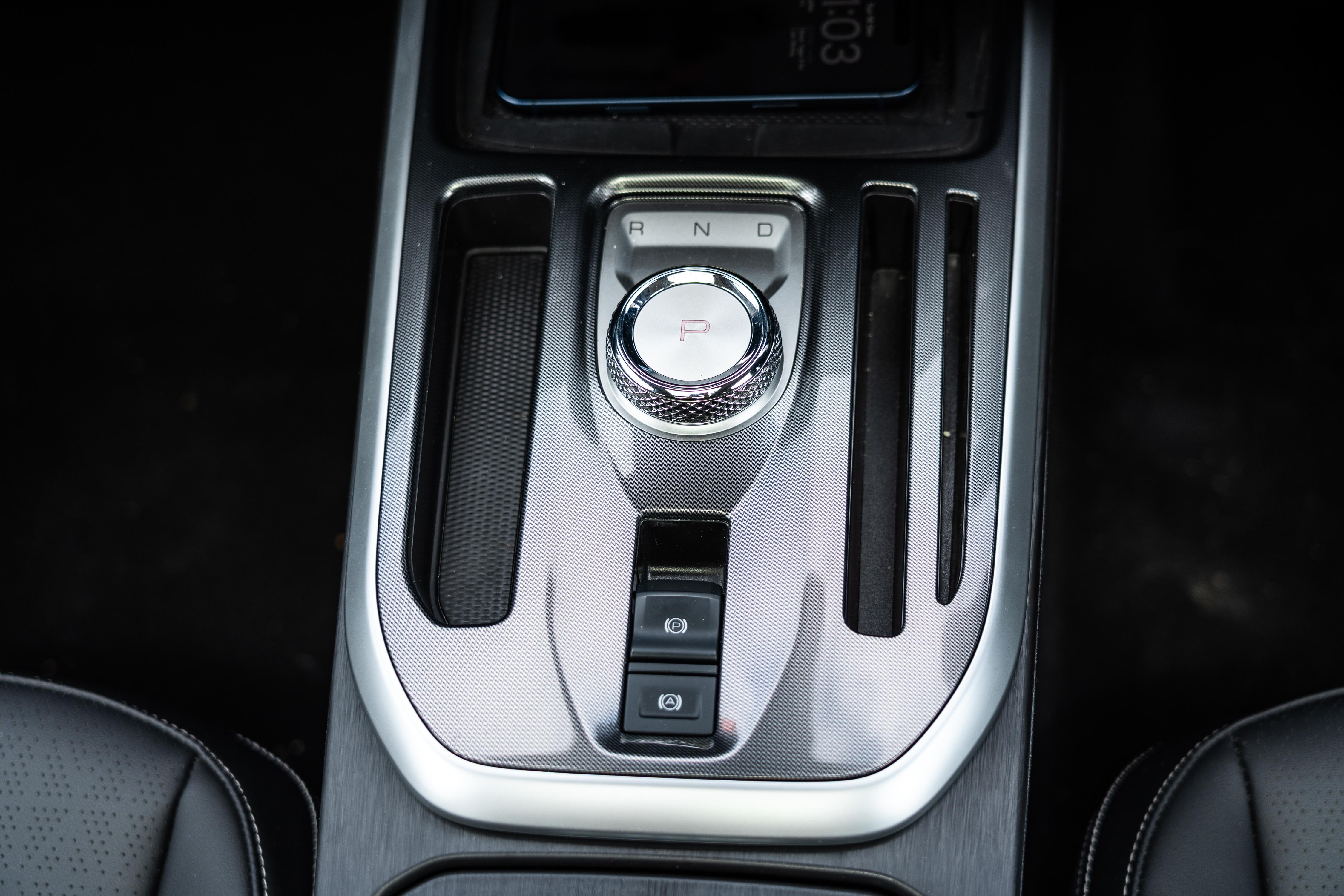 There’s still a sparse centre console with an obnoxious, infinitely spinning rotary gear selector, three oddly sized slots, a wireless phone charger that generates some heat when in use, and a pair of lidded cupholders. Underneath is a sizeable tray with USB-A and USB-C ports and a 12V outlet.
