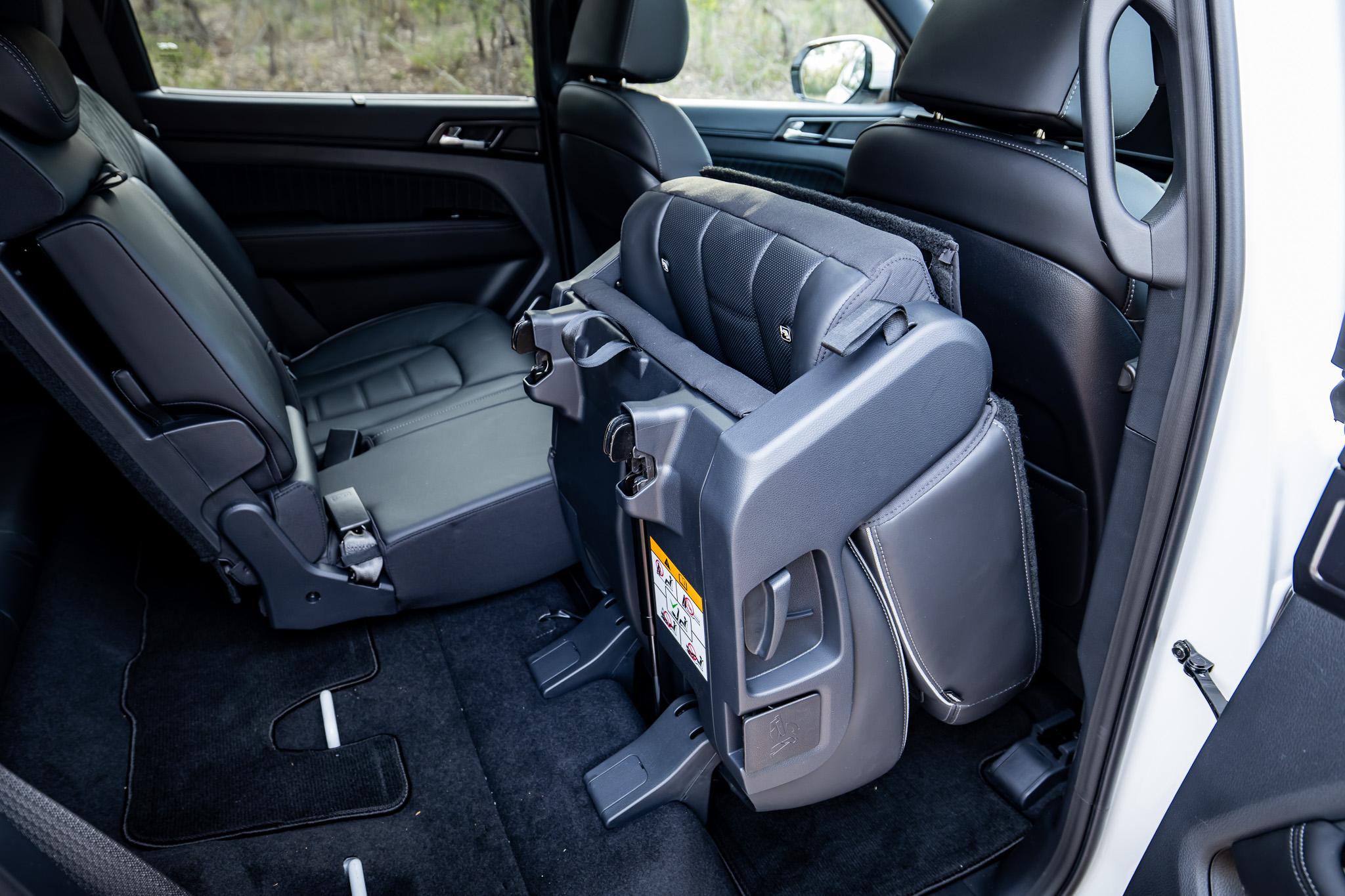 When it comes to third-row access, the middle row doesn’t slide to make it breezier to get in, but it does have a flip-tumble system with a two-stage movement, so it can be a handful to manage if you’re less muscular. And with the driver’s seat set to my position, I couldn’t tumble the seat forward without shifting my seat. If you’re using the kerbside for third-row access, be aware that it’s the larger portion of the 60:40-split middle row on that side in Australia, meaning it might be more difficult.