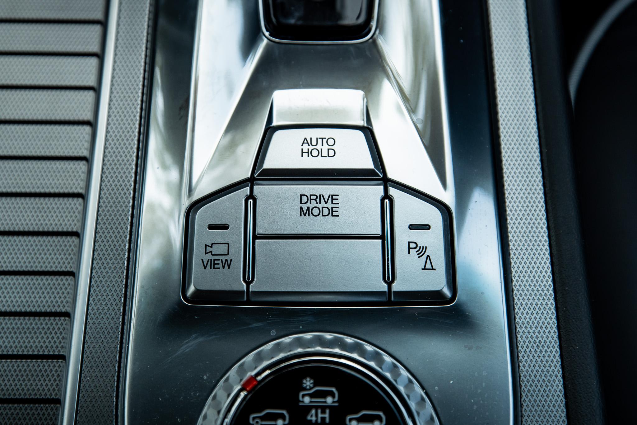 Also between the seats is a dinky little gear selector with separate park button (and a note to the speedy parkers out there – you really need to make sure it goes into R or D when you’re shifting, otherwise you’ll end up in N and revving without motion). There’s also a drive mode selector, and a four-wheel-drive rotary dial with 2H, 4H and 4L settings.