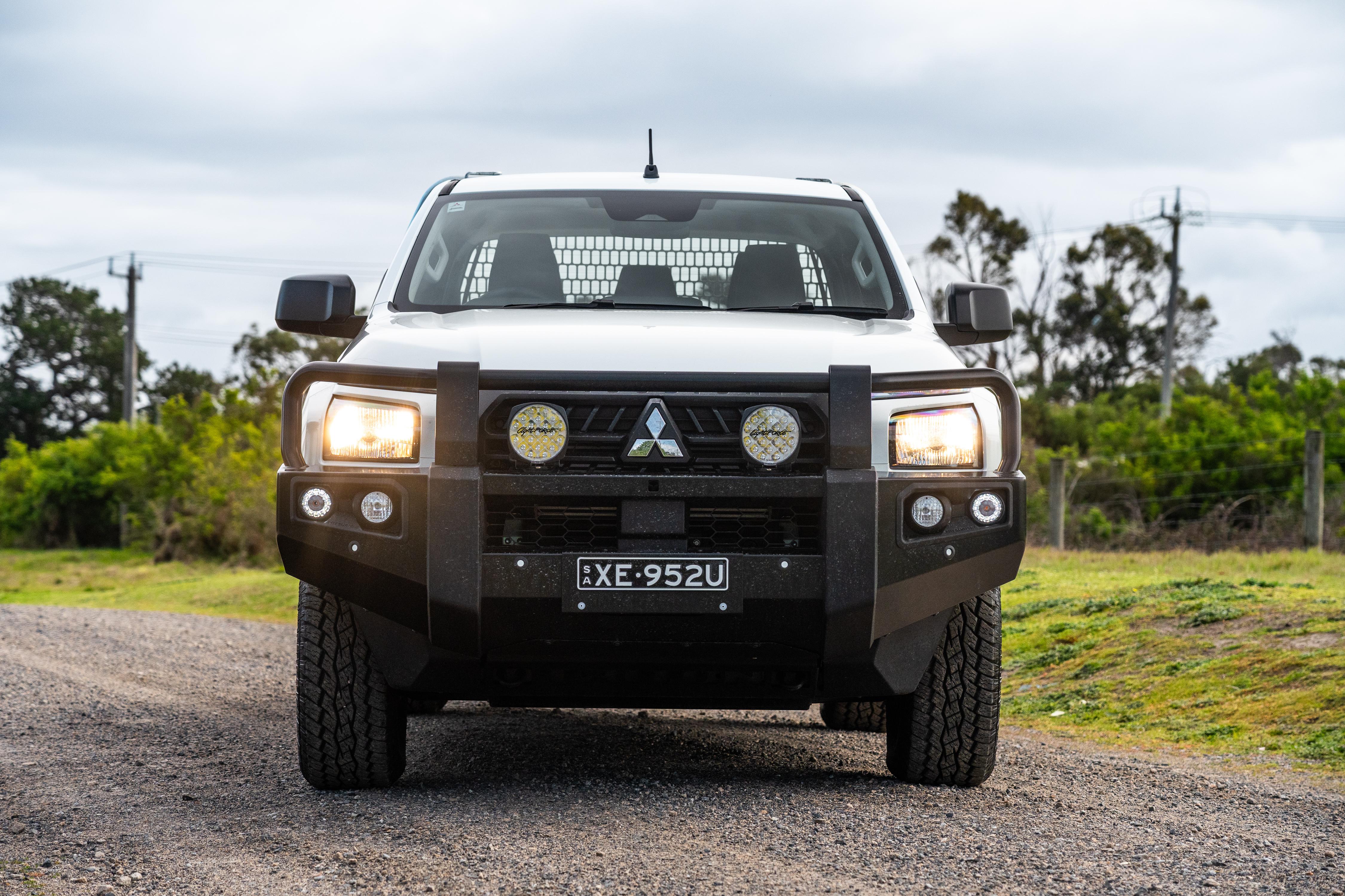Its utilitarian look is completed by unfinished black plastic door handles and mirror caps, along with a robust black Mitsubishi bull bar adorned with Lightforce spotlights.
