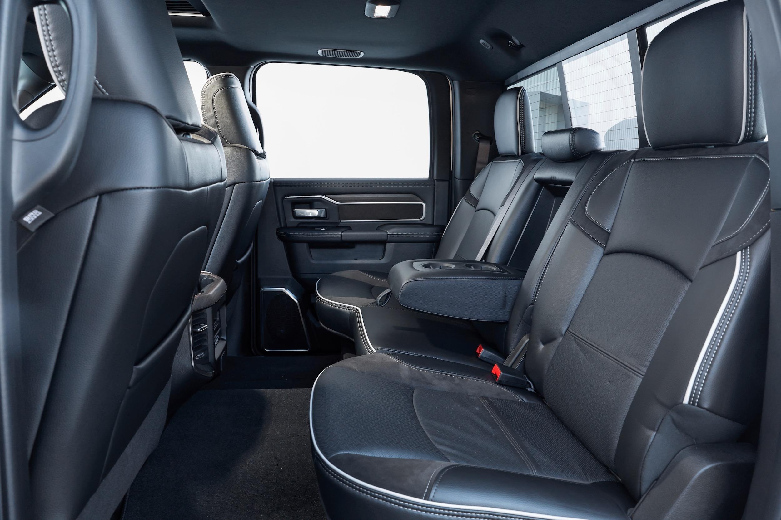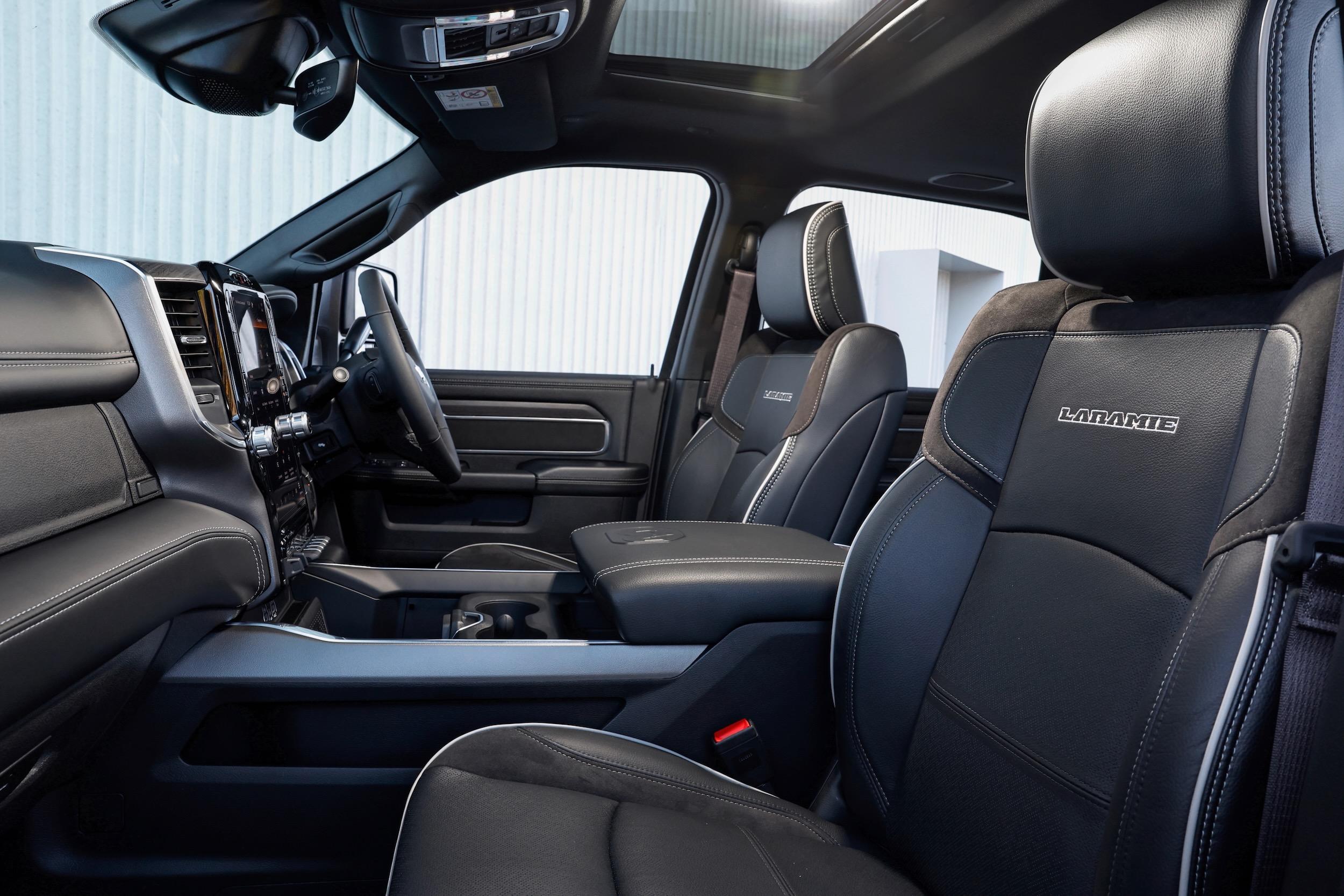 This is the most premium heavy-duty Ram yet sold officially in Australia. The front row offers two big leather-trimmed bucket seats flanking a full-length multi-layer centre console, and featuring heating and ventilation, eight-way power adjustment, and driver’s memory.