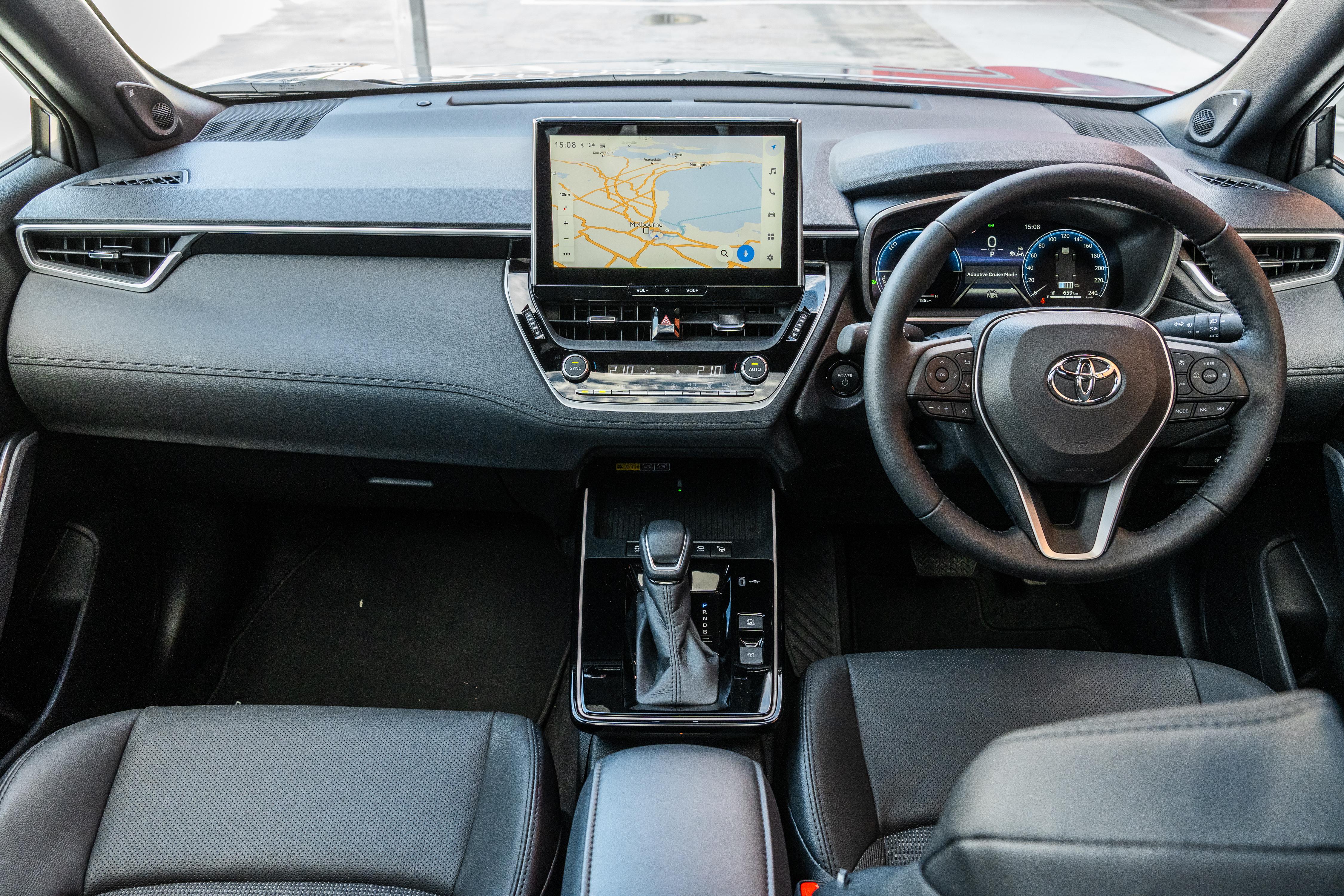 The electric motor will often engage all four wheels when accelerating from a standstill, providing improved traction, which is particularly useful in the wet. None of this changes the way the Corolla Cross behaves in everyday driving, and there’s a dedicated button to lock it in EV mode at city speeds.