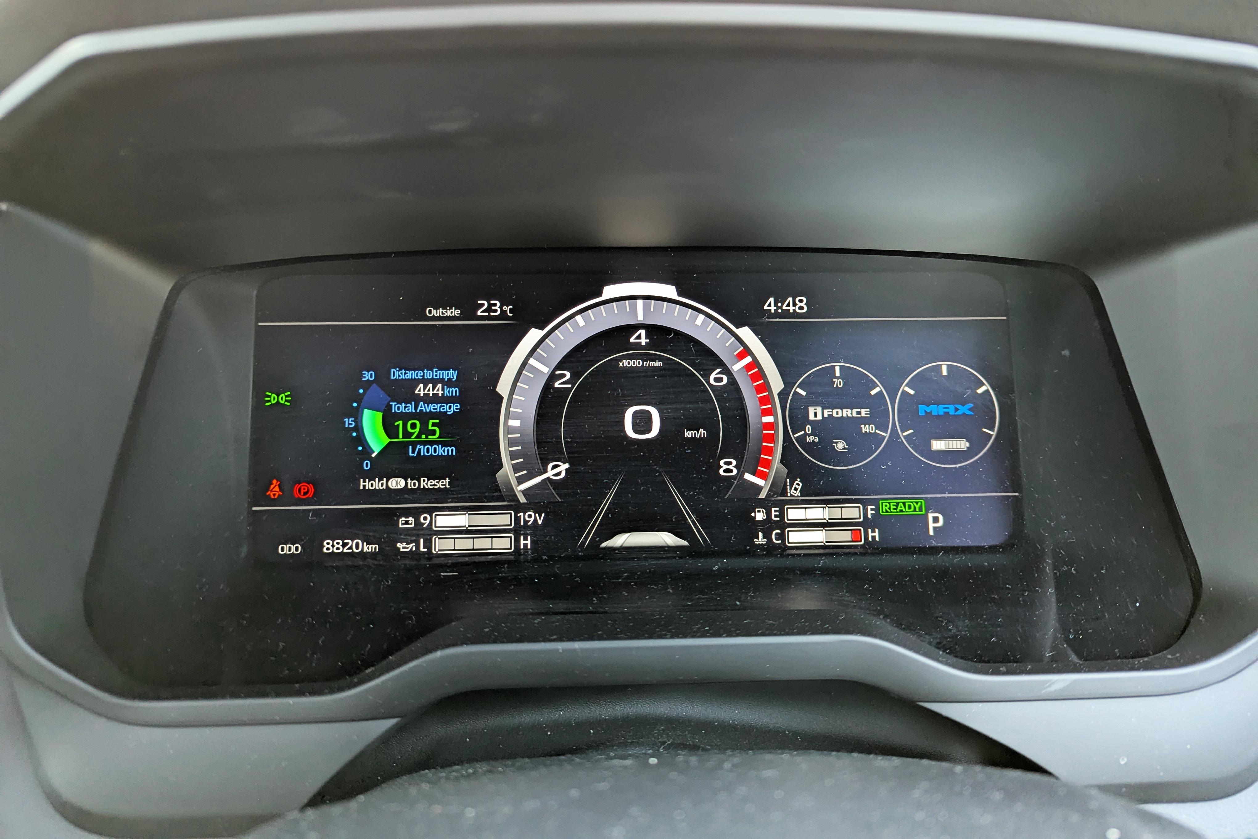 The digital instrument cluster is also clear and legible, with analogue-look gauges for the speedometer, turbo boost, and hybrid system. You don’t need to look down here for your speed, as Toyota has also fitted a handy head-up display.