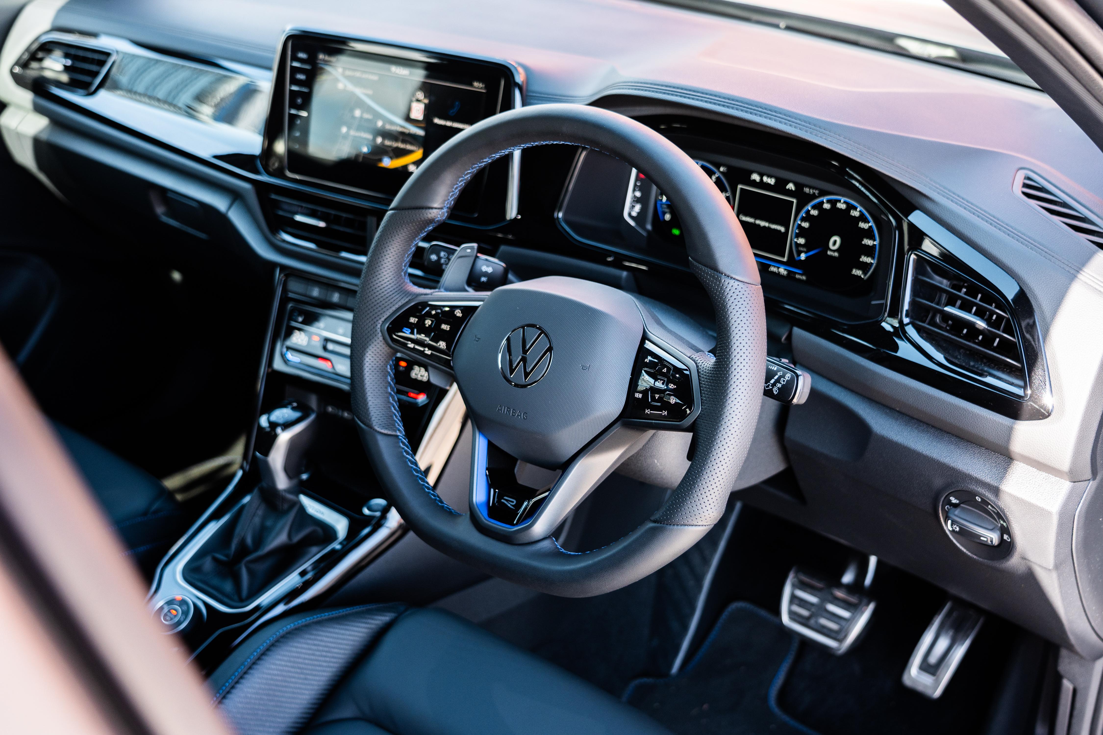 There aren’t really any Wolfsburg-specific additions in the cabin, but the T-Roc R’s interior is quite good on its own. You may notice some extra glossy black trim on the infotainment screen and the air vent surrounds, which look fine in images but contribute to the piano-black overload in real life.