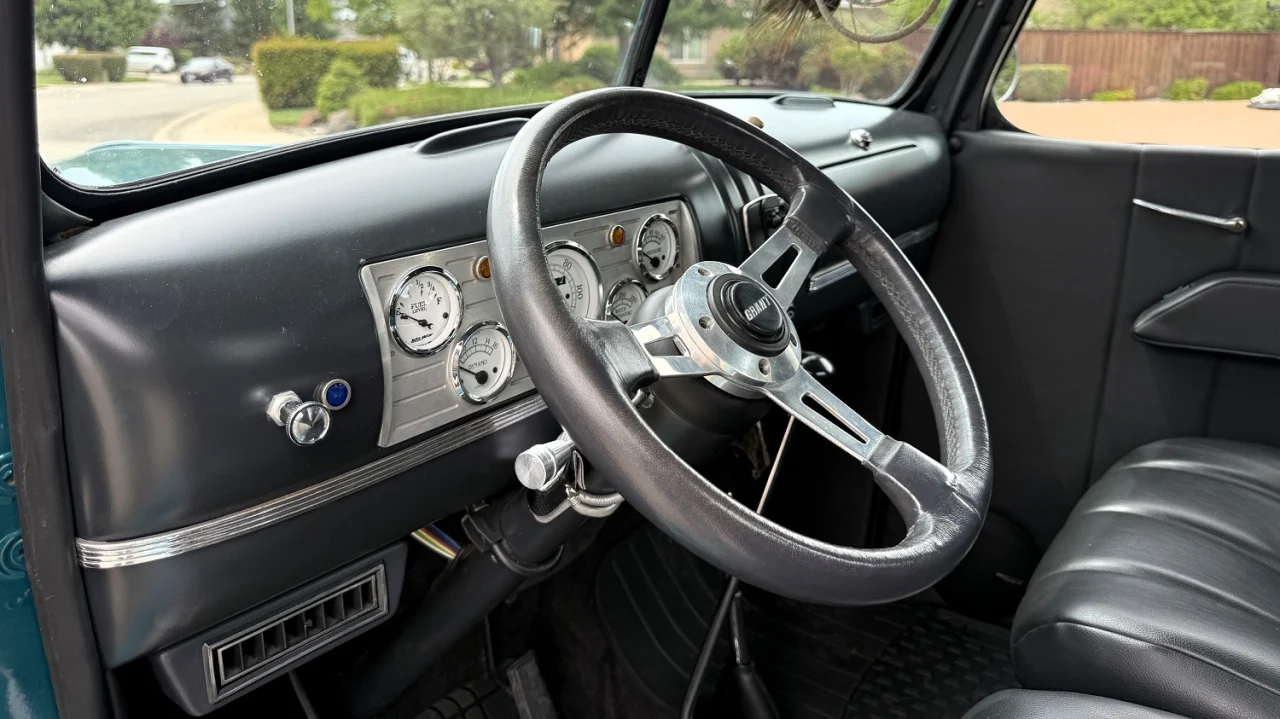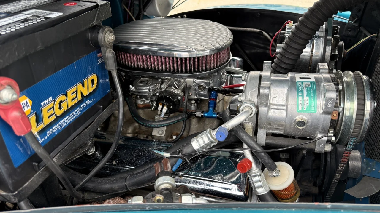 Under the V-shaped hood, the original engine was replaced with a Chevrolet 350ci V8 crate engine that features a Quick Fuel Technologies four-barrel carburetor and aluminum intake manifold. The HEI distributor’s ignition module, cap, and rotor were replaced last year. In addition, the original transmission was swapped out for a three-speed automatic. Check out the video below to see and hear this truck in action.