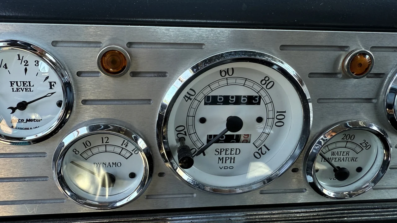 The VDO and Auto Meter instrumentation consists of a 120-mph speedometer and gauges for fuel, voltage, water temperature, and oil pressure. The odometer shows 6,963 miles, but this truck’s title indicates it’s mileage-exempt.