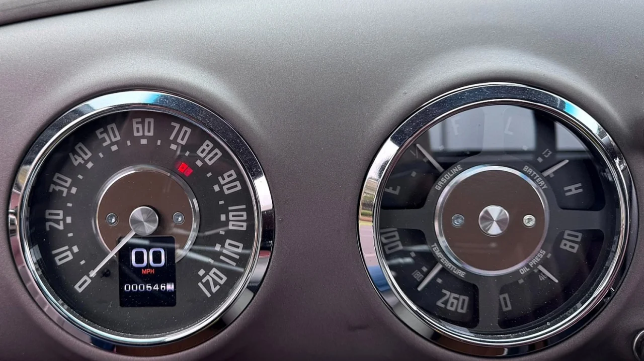 Instrumentation consists of a 120-mph speedometer and a multi-gauge that displays the fuel level, voltage, temperature, and oil pressure. The digital odometer shows 546 miles, but this vehicle is mileage-exempt, according to its title.