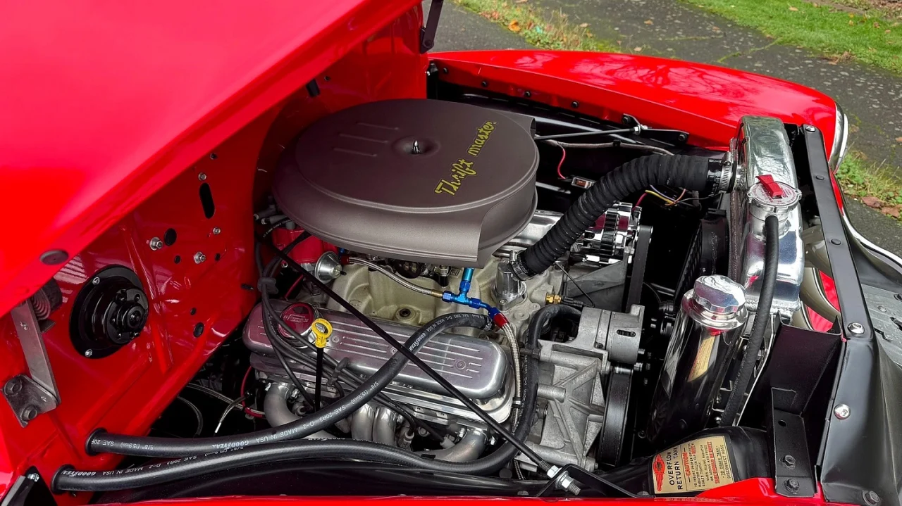 The original engine has been replaced with a Chevrolet Performance 350ci V8 crate engine connected to a four-barrel carburetor. The same goes for the transmission, which is now a four-speed manual gearbox.