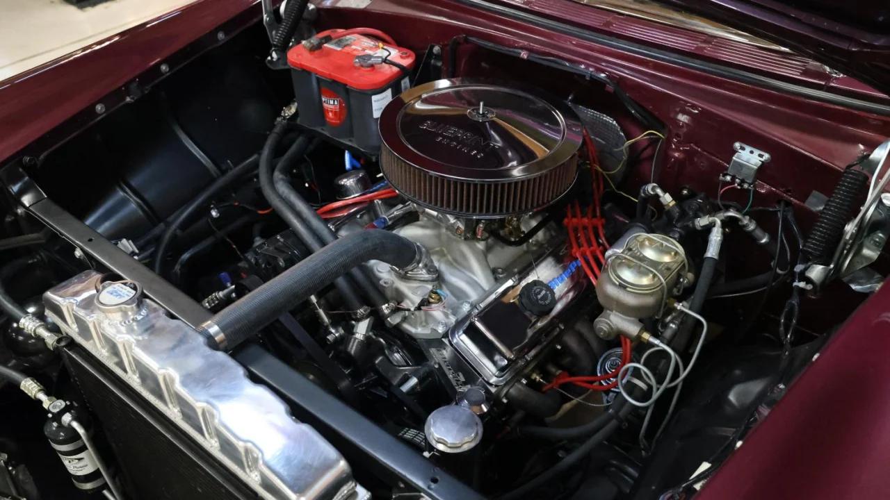The BluePrint Engines 383 stroker V8 is reported to produce an authentic 450 horsepower. It is topped by an aftermarket intake manifold, Holley four-barrel carburetor, and aluminum heads. Other features include a serpentine belt conversion and aluminum radiator. A four-speed 700R4 automatic transmission with 2400-rpm stall converter handles the shifting chores.