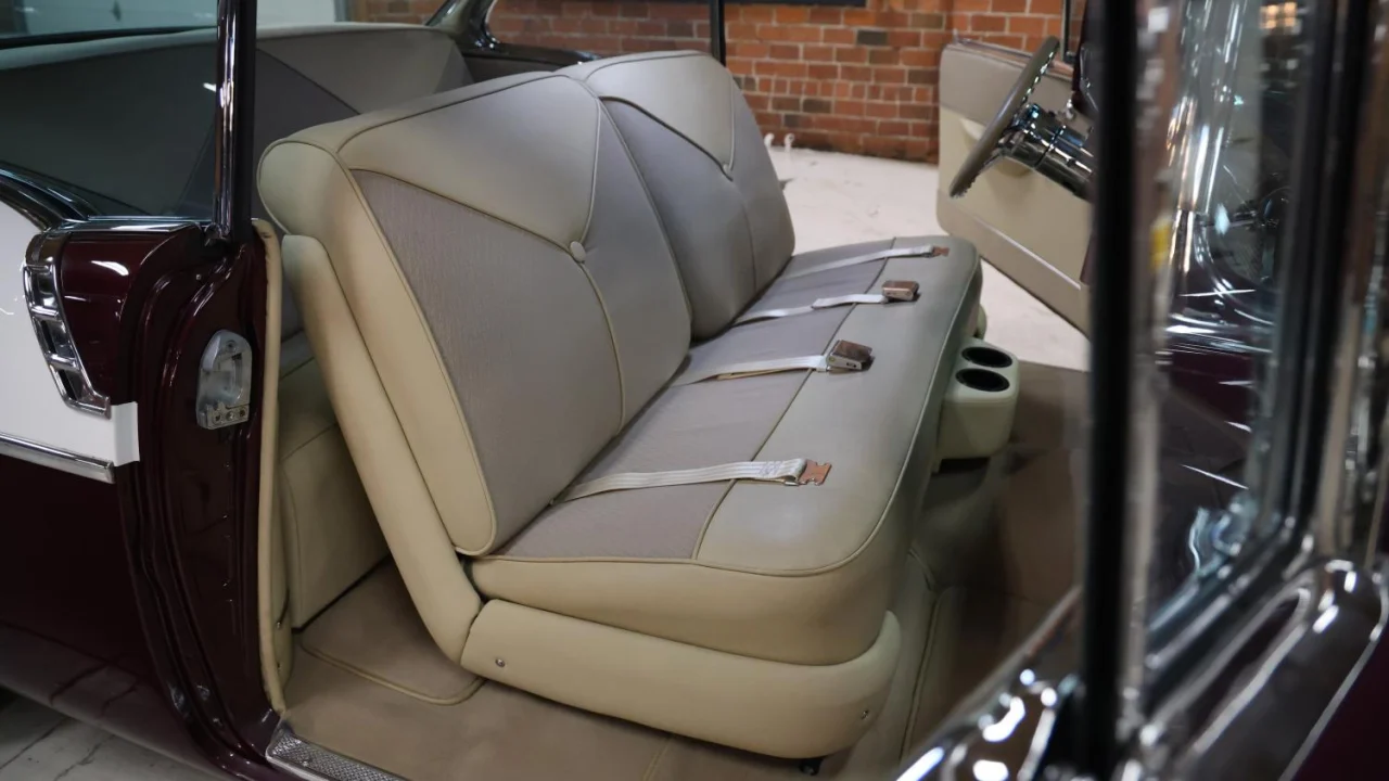 A year has passed since the frame-off restoration of this Tri-Five, with much of the car was solid to begin with. The combination of Dusk Plum and India Ivory is gorgeous, highlighted by tasteful use of chrome around the windows and sides, not to mention the grille. Dual side mirrors are a nice touch, giving a sense of safety when going for a cruise. A set of 15-inch steel wheels with Chevrolet wheel covers is wrapped in staggered-width Nexen whitewall radials—225/75 up front, 235/75 out back.
