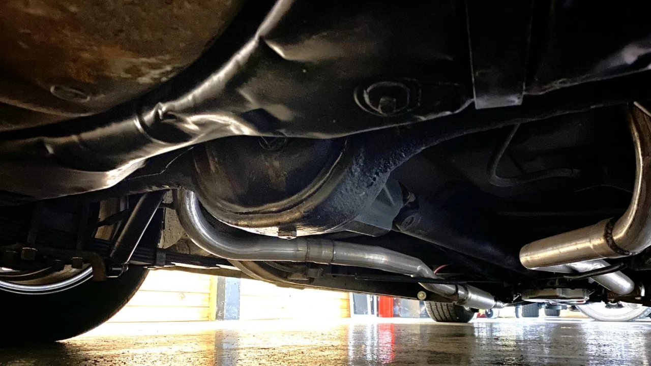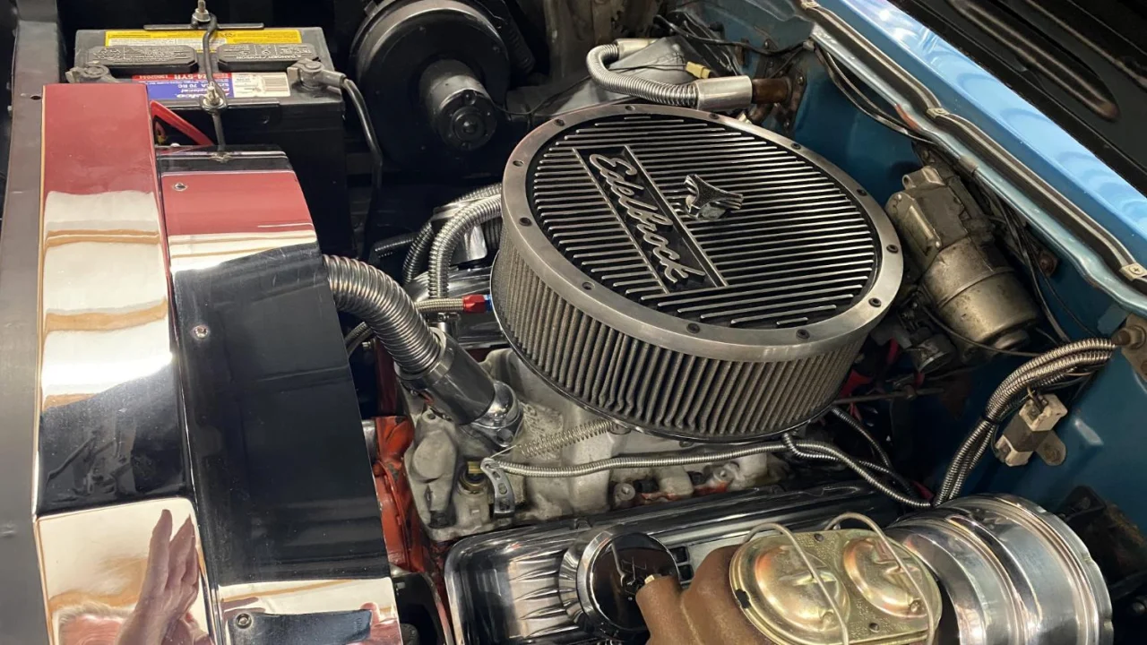 The 400ci small-block V8 is topped by a four-barrel carburetor and two chrome valve covers. Shifting comes from a three-speed TH400 automatic transmission.