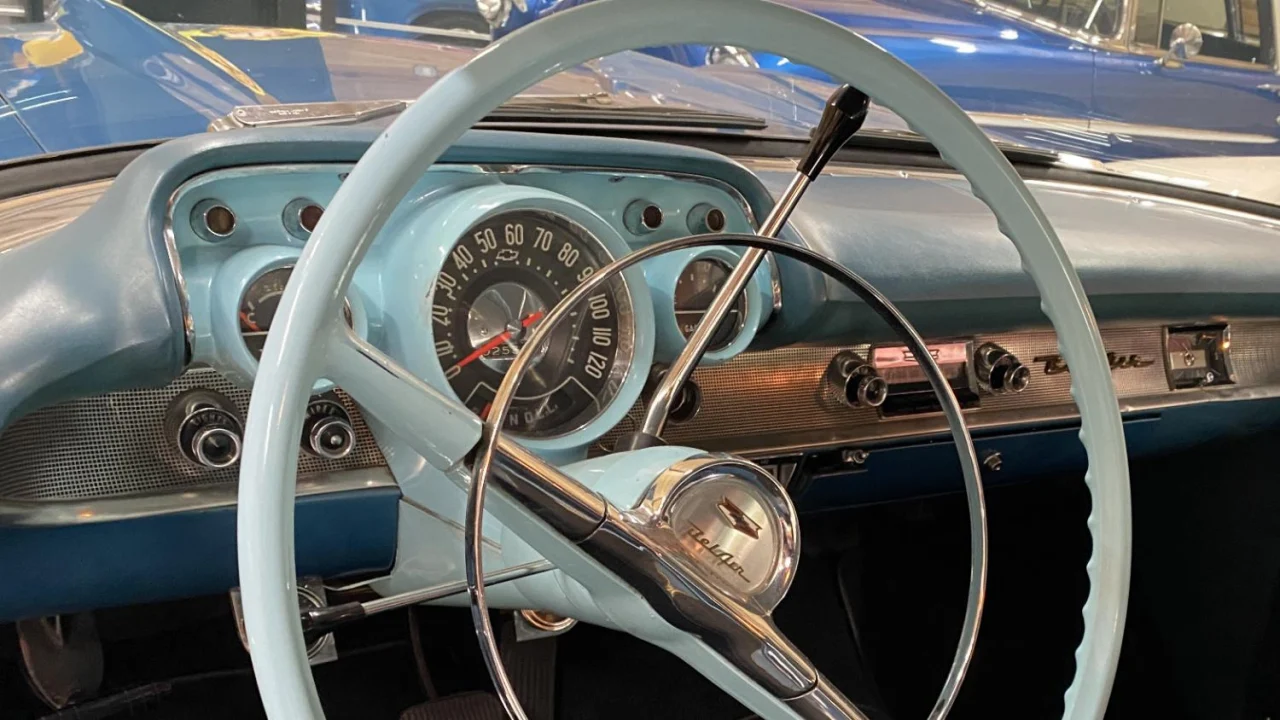 The blue hue is complemented by a white anodized aluminum panel on the rear fenders. Other exterior features include gold anodized aluminum nameplates, crests, and front fender louvers, dual side mirrors, front bumper “Dagmars,” twin hood ornaments, and more. A set of 15-inch Billet Specialties wheels are wrapped in staggered-width BFGoodrich radials, 215/60 up front, 235/60 out back.