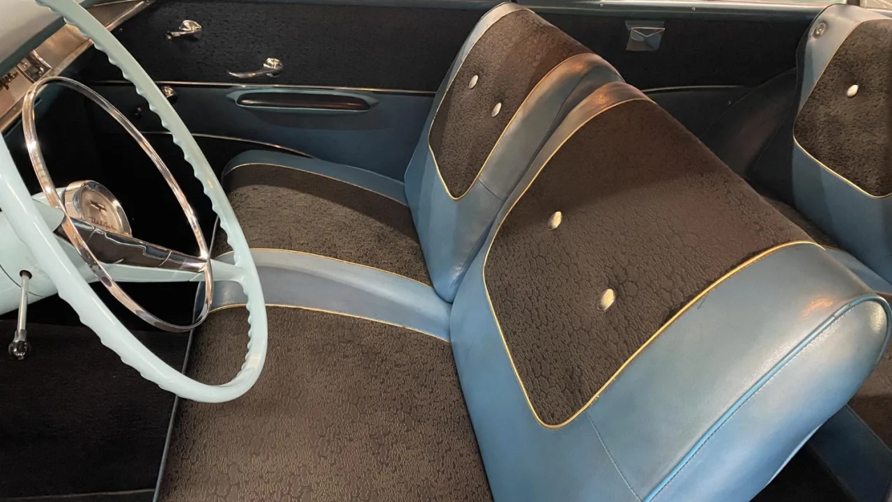 The interior features blue vinyl with black cloth seats. Other interior features include column-mounted automatic transmission shifter, power steering, clock, factory AM radio, and more. Rear window slats help keep things cool.