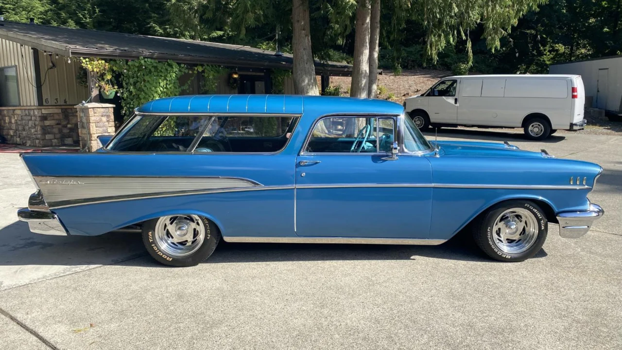 Currently listed on AutoHunter is this 1957 Chevrolet Nomad. While the Nomad name was used for many years, the “true” hardtop wagon version was only produced for three years, with 1957 being the final iteration. This one is powered by a modified 400 small-block V8 hooked up to a Turbo Hydra-Matic transmission. Features include power front disc brakes, power steering, rear window slats, Billet Specialties wheels, and more. Painted bright blue with a blue vinyl and black cloth interior, this classic Tri-Five is offered by the selling dealer with a clear title.