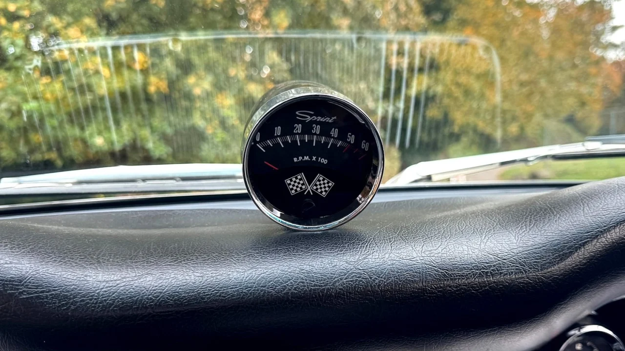 Instrumentation consists of a 100-mph speedometer, dash-mounted 6,000-rpm tachometer, and gauges for the temperature and fuel level. The odometer shows 40,589 miles, but this vehicle’s title indicates that it’s mileage-exempt.