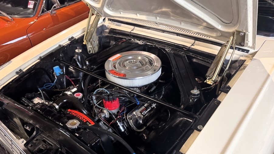 According to the dealer, the rebuilt 260ci V8 under the hood is original to the car. It comes connected to a two-barrel carburetor and a C4 three-speed automatic.