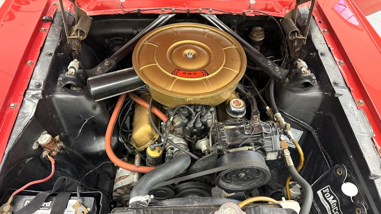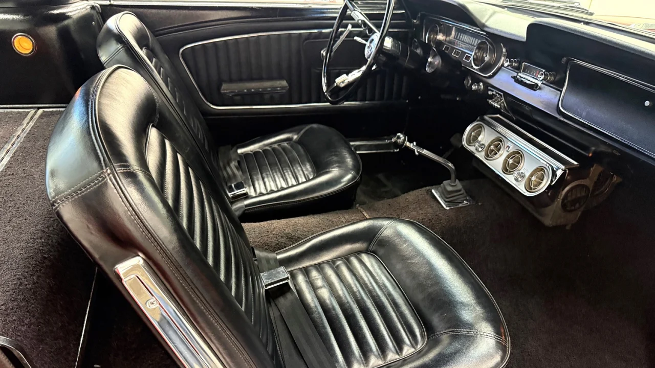 Around 2010, this Mustang was restored to factory specifications, according to the dealer. As part of the restoration, the body was refinished in its original color of Rangoon Red. Exterior features include chrome bumpers, bright trim and rocker panel moldings, and sail panel louvers. The dual exhaust outlets end just before the lower rear valance.