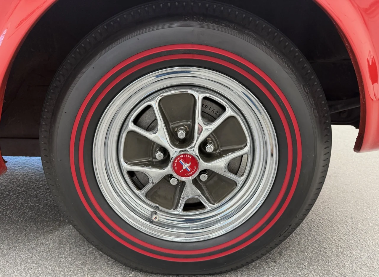 The horseshoes on this Mustang are 6.95-14 BFGoodrich Silvertown 660 redline tires wrapped around 14-inch chrome-plated steel wheels.