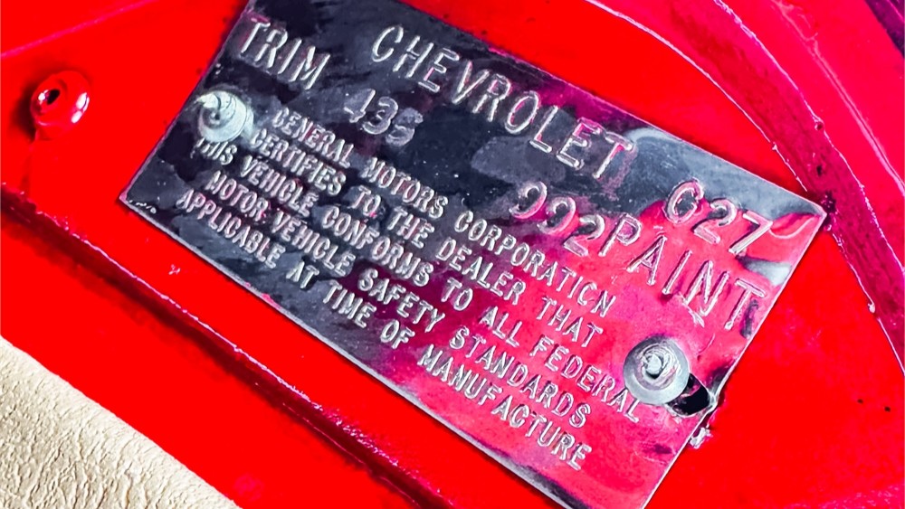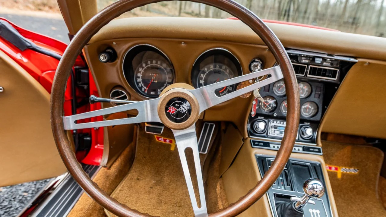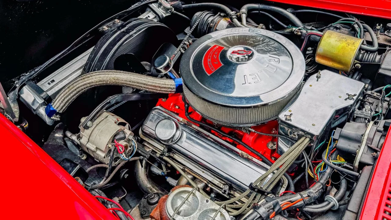 This Corvette was originally painted Corvette Bronze but was repainted in the bright red you see here. Features include T-tops, silver-painted gills, an L88 hood, side pipes, and more. The 15-inch Rally wheels are wrapped in 215/70 BFGoodrich Radial T/A raised-white-letter tires.