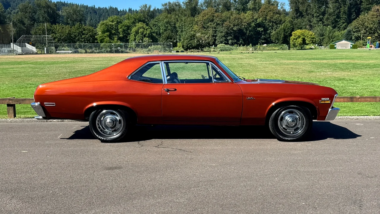 The seller describes this 1971 Nova as being powered by a 350ci V8 backed by a three-speed automatic transmission. The car is finished in its original color of Classic Copper over a black cloth and vinyl interior. It is offered by the selling dealer in Oregon with the original window sticker, Protect-O-Plate, documentation, manuals, receipts, and a clear title.