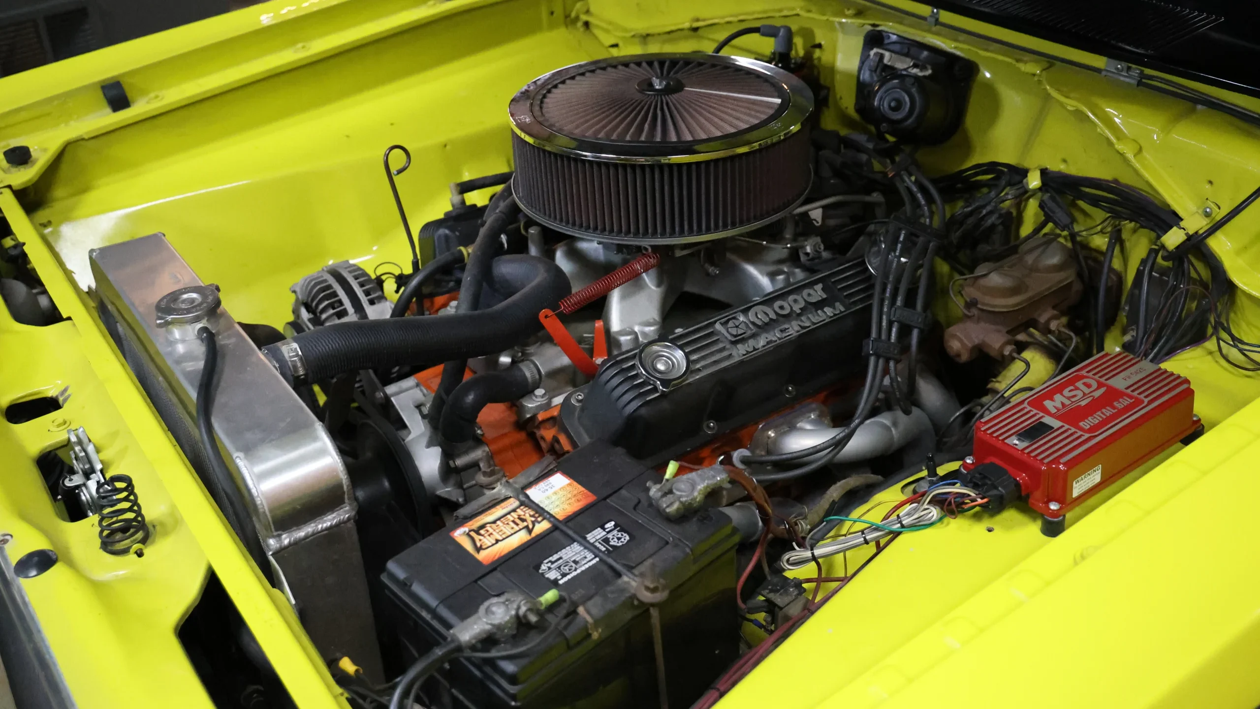 Overall, this Duster looks to be an excellent example, having been judged at the Monster Mopar Weekend in 2009, 2010, and 2011. Now finished in the great-looking color of Curious Yellow with black stripes and “340” decals, the car’s original (and quite boring) color was Tunisian Tan (code GT2). It also features a Ramcharger hood. The car rides on 15-inch chrome Cragar wheels clad with 225/60 BFGoodrich radial front and 275/30 Nitto Extreme Drag rear tires.