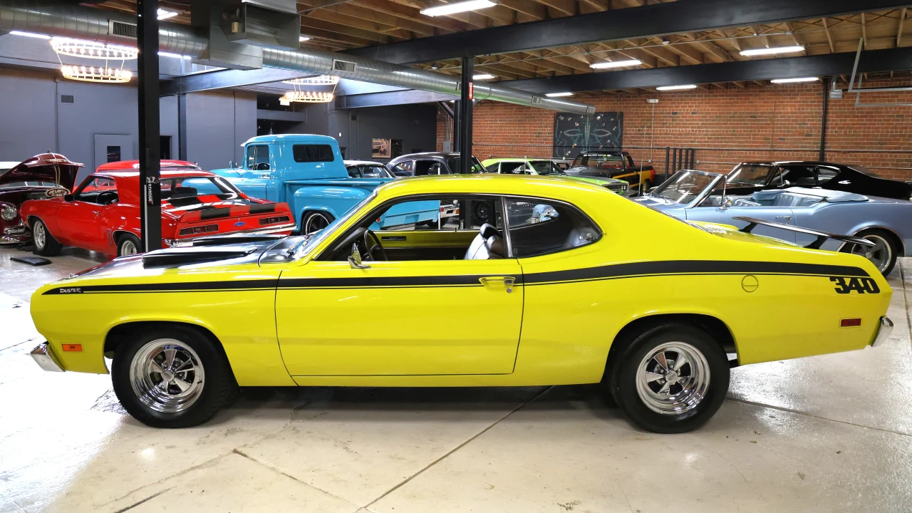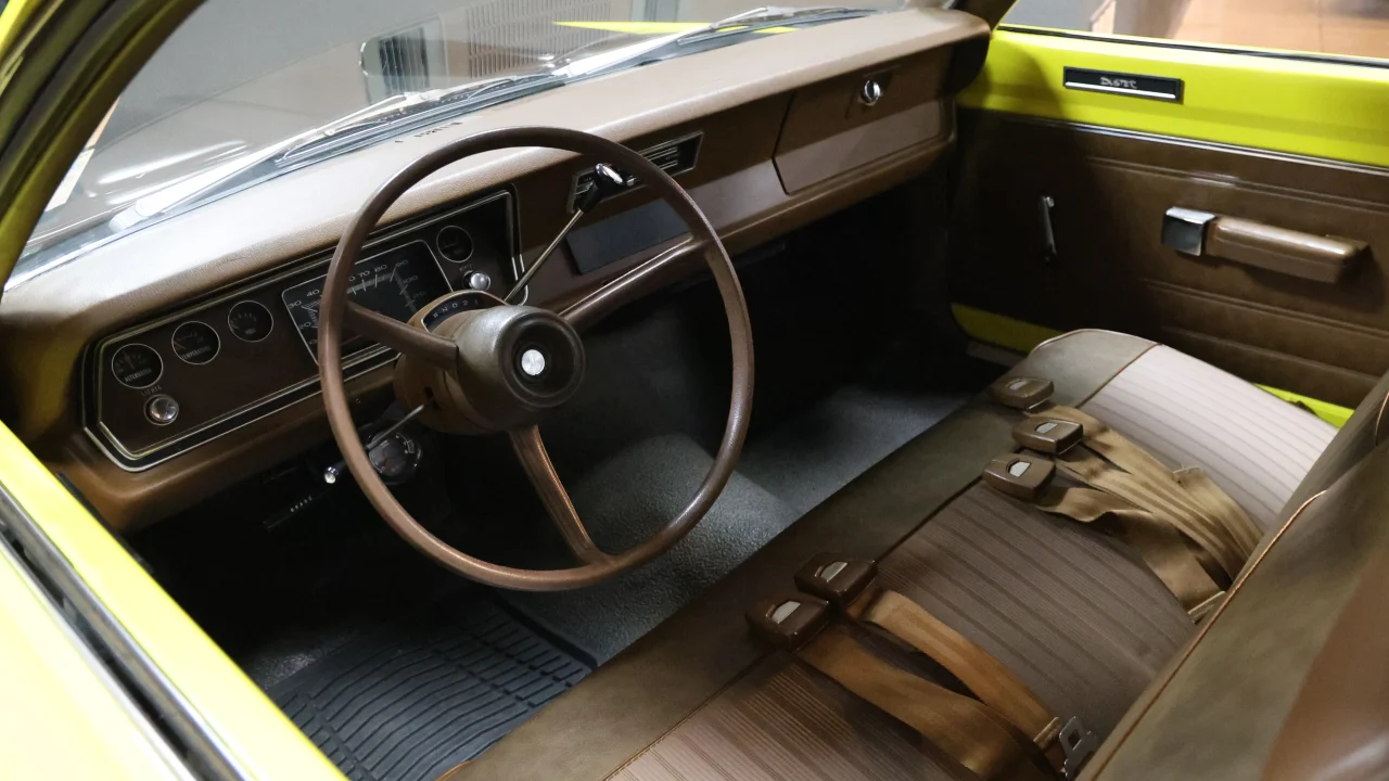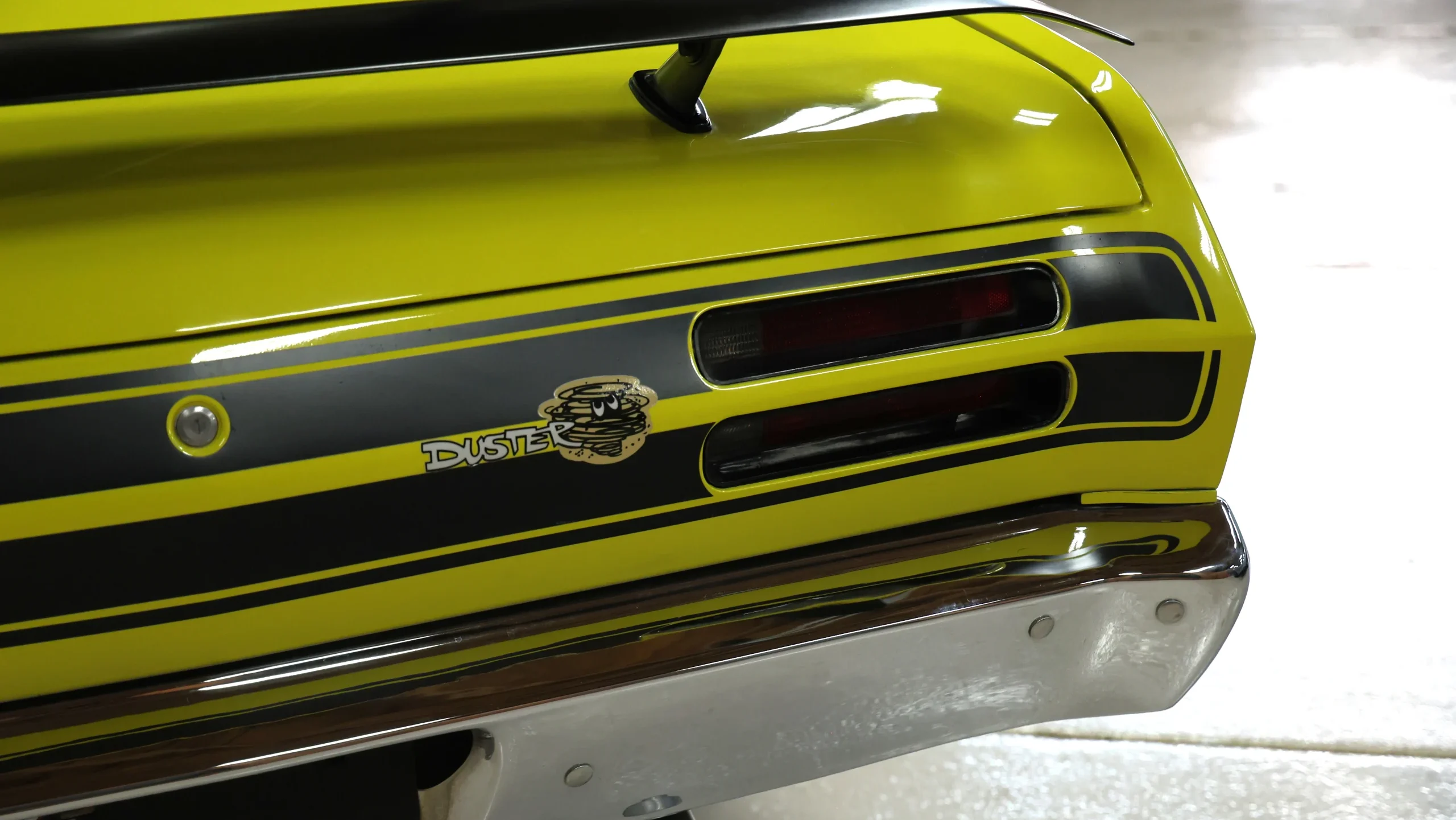 The seller describes this Duster as being powered by a Mopar Performance 360ci V8 mated to a three-speed 904 automatic transmission with 2700 stall converter. Finished in Curious Yellow over a Chestnut vinyl interior, this classic is offered by the selling dealer with a build sheet and clear title.
