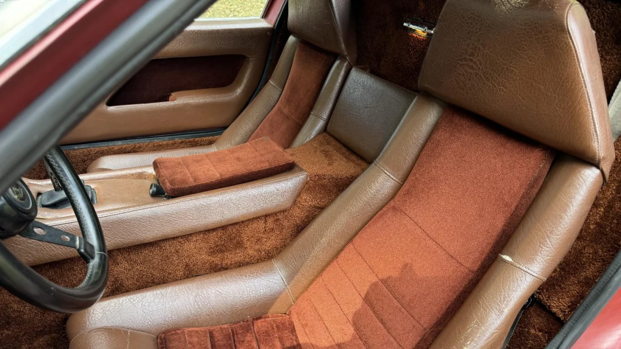 The brown interior features vinyl and velour bucket seats, and a center console with a manual shifter. Other interior features include power accessories including windows, locks, and steering, heater, and “radio-delete” plate.