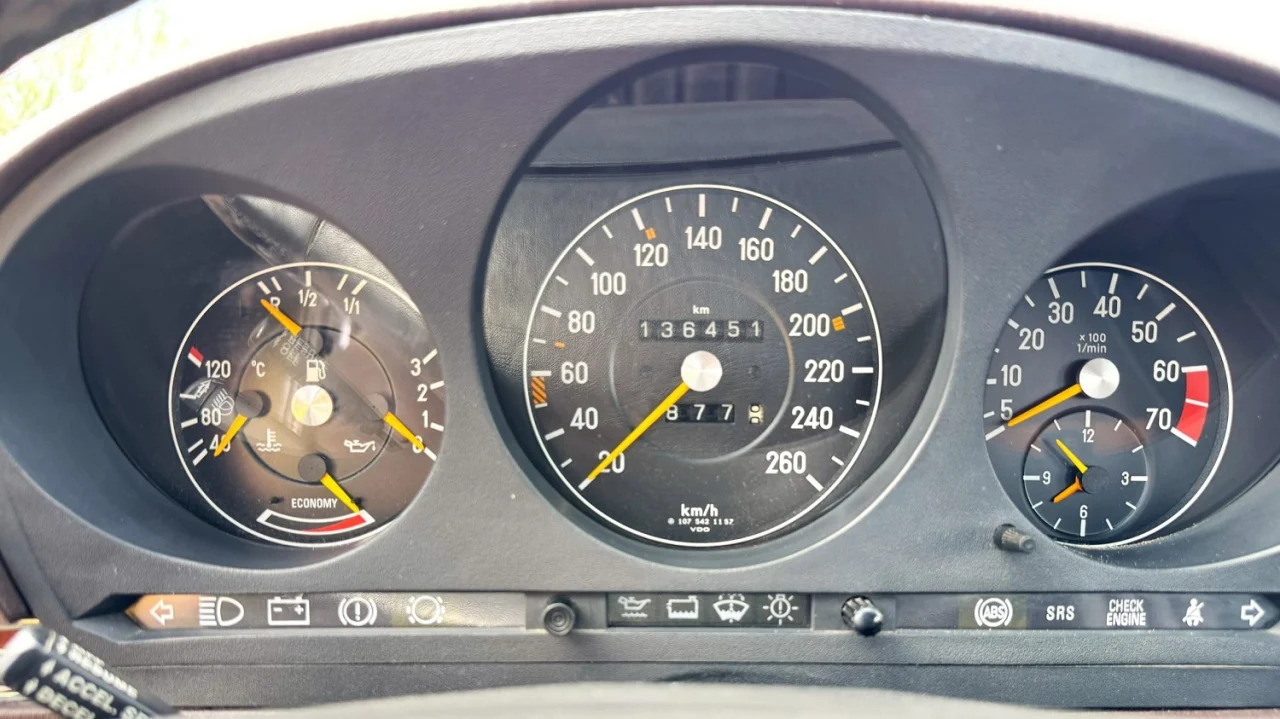 Instrumentation consists of a 260-kph speedometer, 7,000-rpm tachometer, clock, and gauges for the temperature (in Celsius), fuel level, oil pressure, and fuel economy. The odometer shows 136,451 kilometers (84,786 miles), which is slightly above the CARFAX report’s latest mileage reading of 84,556 miles from April 2025.