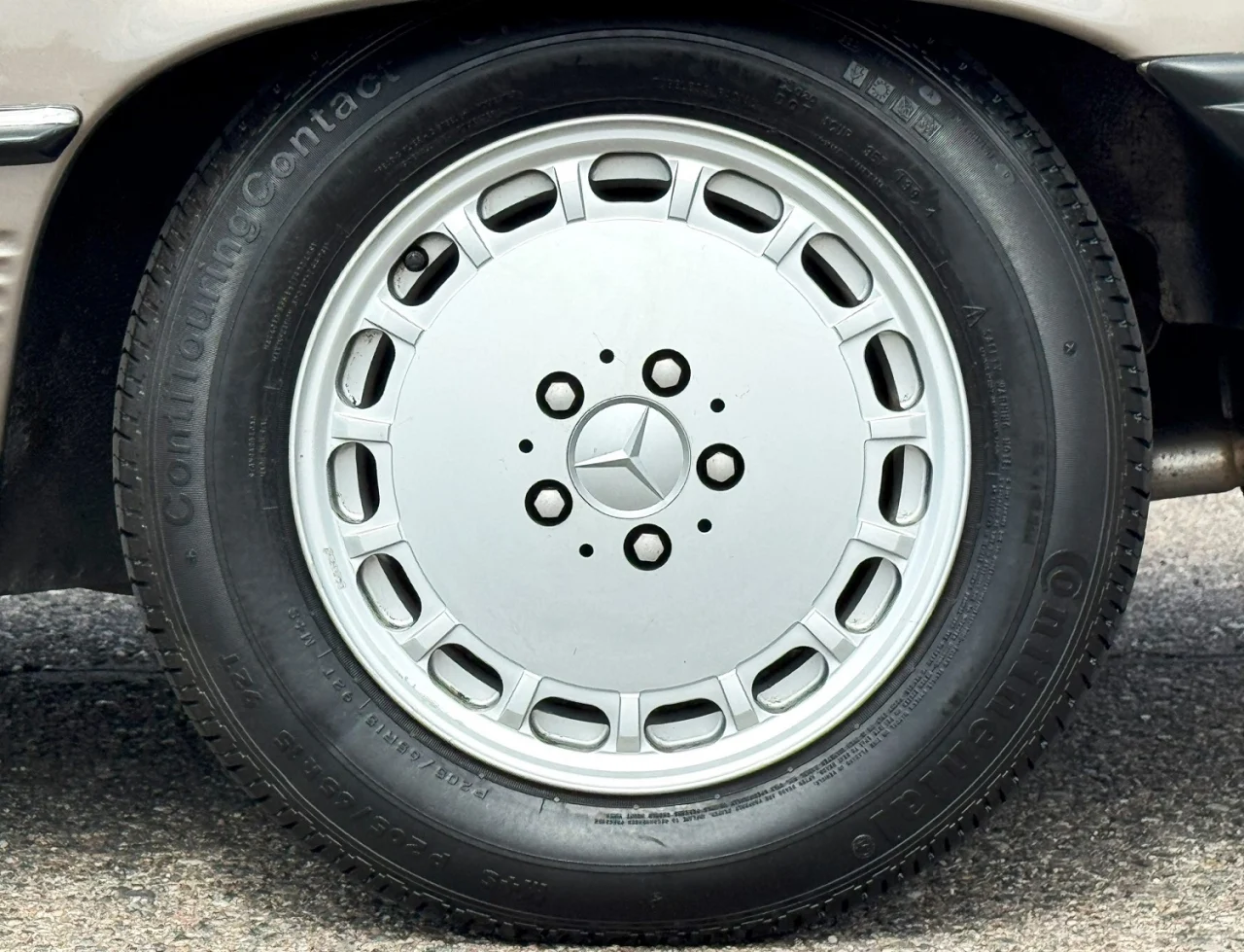 Whether the top is up, down, soft, or hard, this SL cruises down the road on a set of 15-inch “Gullideckel” wheels and 205/65 Continental ContiTouring Contact tires. Behind the wheels are power four-wheel antilock disc brakes.