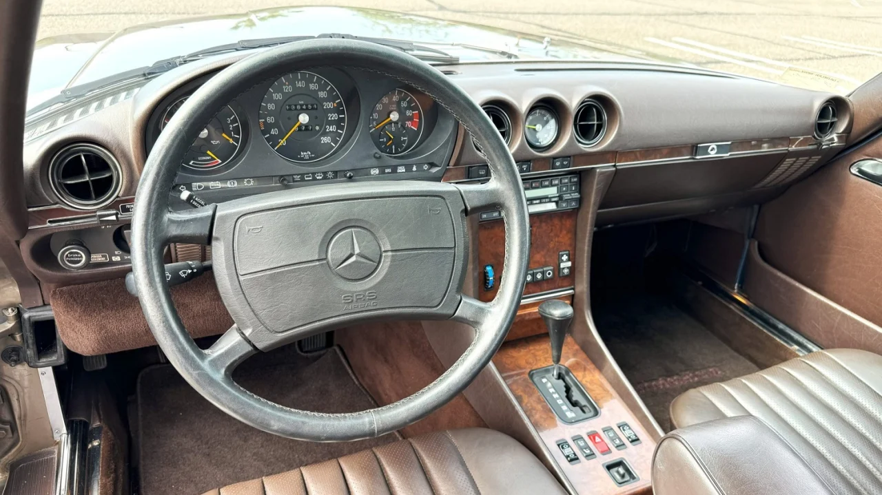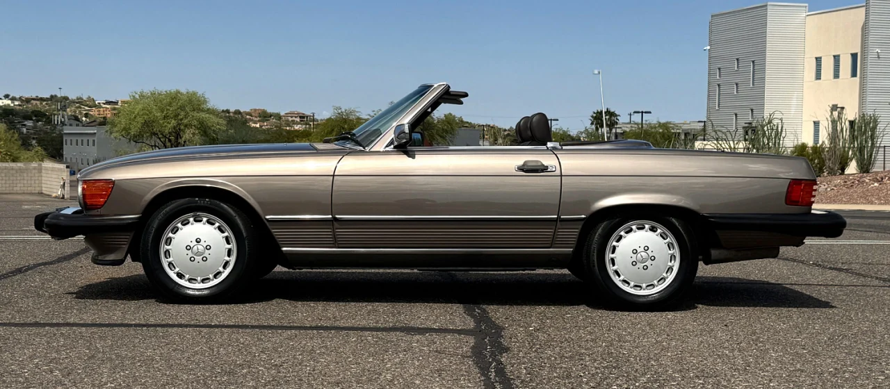 Right now on AutoHunter, you can find this 1989 Mercedes-Benz 560SL, which was originally a Canadian-market car and imported into the U.S. earlier this year. It’s powered by a 5.5-liter V8 connected to a four-speed automatic. Finished in Desert Taupe Metallic and equipped with a dark brown convertible top over a Brazil Brown leather interior, this final-year R107 SL is now offered by the selling dealer in Phoenix. It comes with a color-matched removable hardtop, car cover, owner’s manual, service log, maintenance records, ownership history, clean CARFAX report, and clear title.
