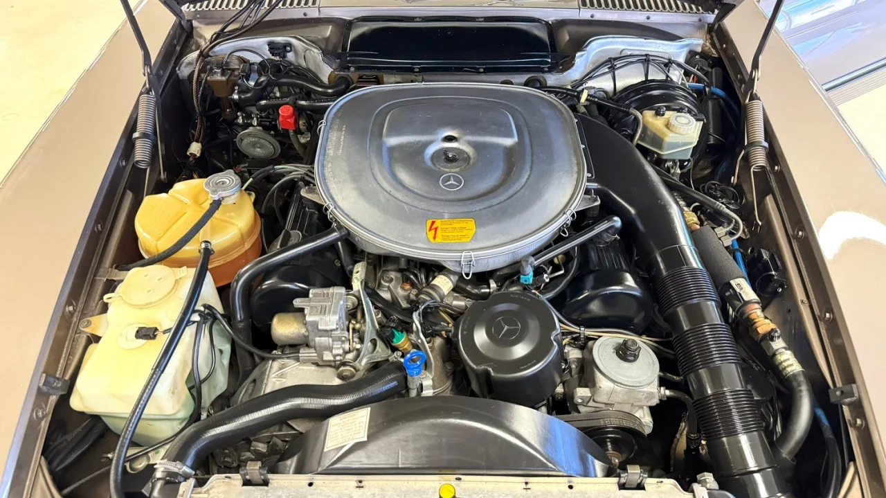 The M117 5.5-liter V8 is fuel-injected and paired with a four-speed automatic transmission. Earlier this year, the engine was fully serviced, the A/C was recharged, and the fuel pumps, gas tank, air injection pump, and main engine computer were replaced.
