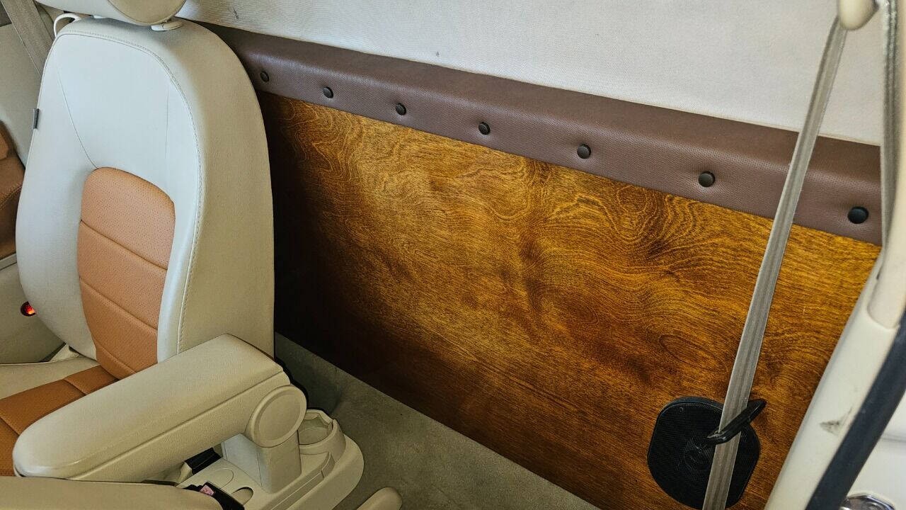 The interior features cream and orange leather upholstery. A set of bucket seats surrounds a console housing an automatic shifter with Tiptronic manual control and sport mode. Other features include air conditioning, aftermarket three-spoke wooden steering wheel with power steering, power windows and locks, and aftermarket Jensen AM/FM stereo with USB and Bluetooth compatibility.