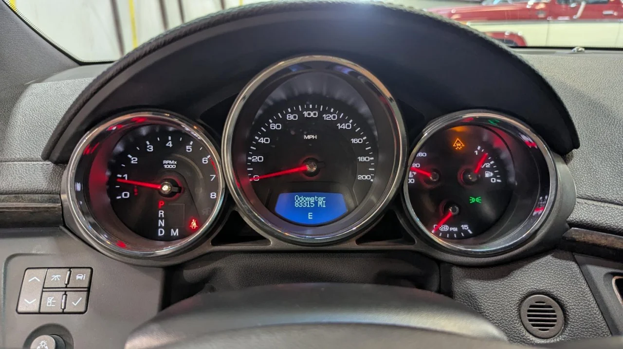 Instrumentation includes a 200-mph speedometer, 8,000-rpm tachometer, and gauges for the boost pressure, coolant temperature, and fuel. The odometer currently shows 83,315 miles, which is in line with the most recent CARFAX reading from February 2023.