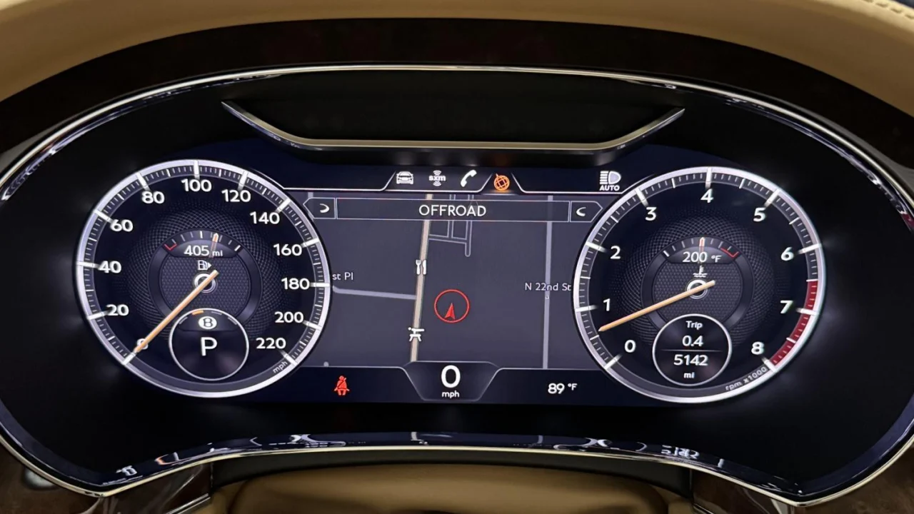 The instrument panel consists of a 220-mph speedometer, an 8,000-rpm tachometer, gauges for the fuel and water temperature, and a GPS display. A rotating display on the center portion of the dashboard includes a thermometer, compass, and stopwatch. The odometer shows 5,142 miles, which is in line with the CARFAX reading from January of this year.