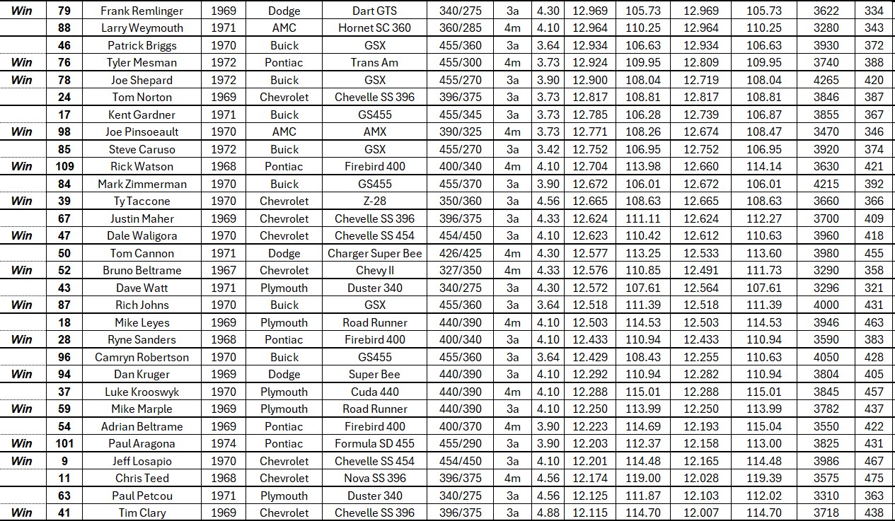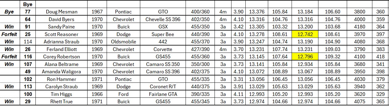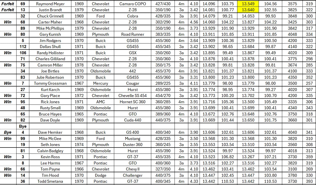 We featured footage a bit over a month ago from the Pure Stock Muscle Car Drag Race. Pictures are fine, but we know there’s a segment of the population who wants to read about ETs. With over 100 cars duking it out, it’s difficult to remember everything (if not anything), especially while announcing from the tower.