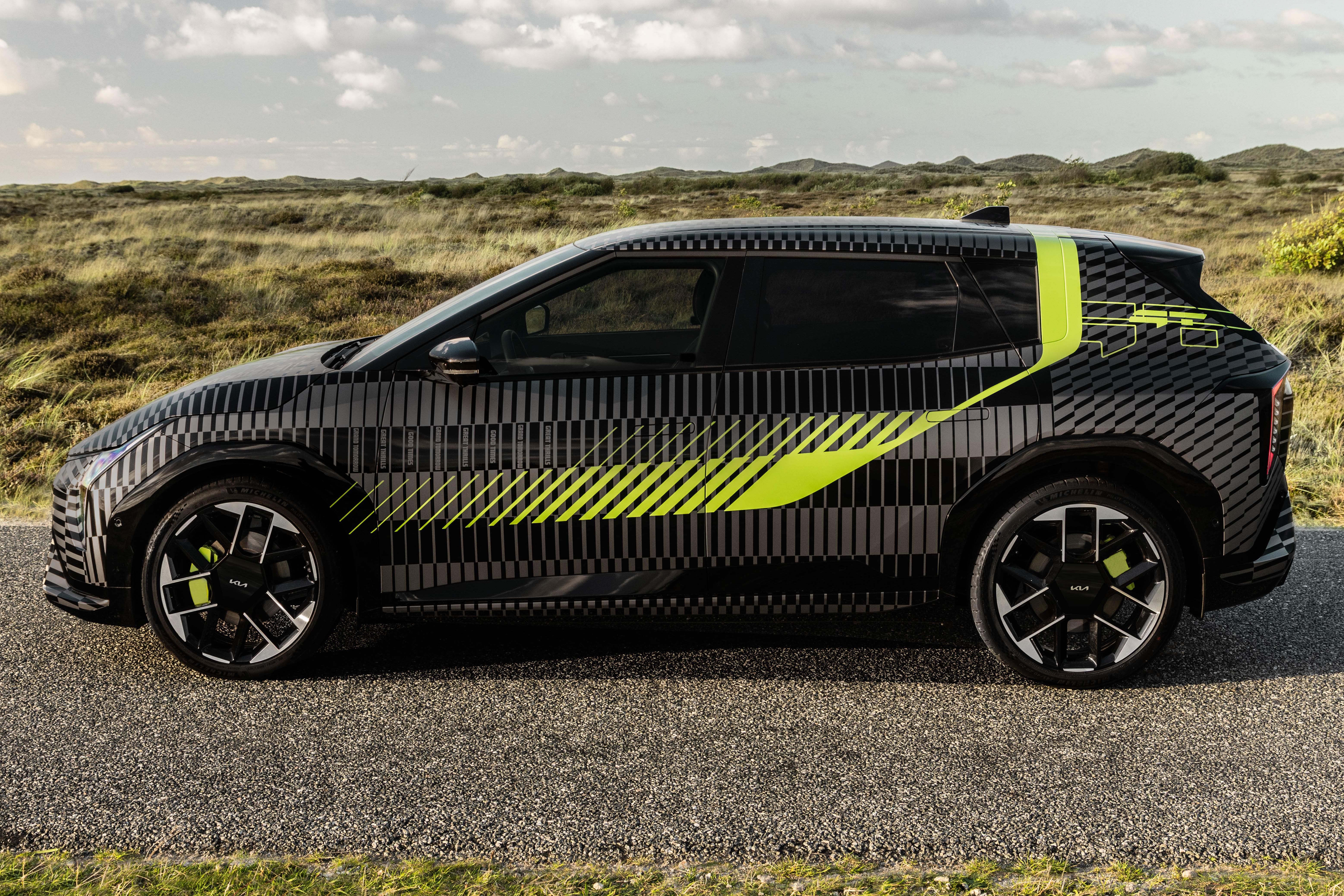 Lime green is the highlight colour of choice for Kia’s electric GT models, and it appears not only on this EV4’s disguise, but is also applied to the brake calipers.