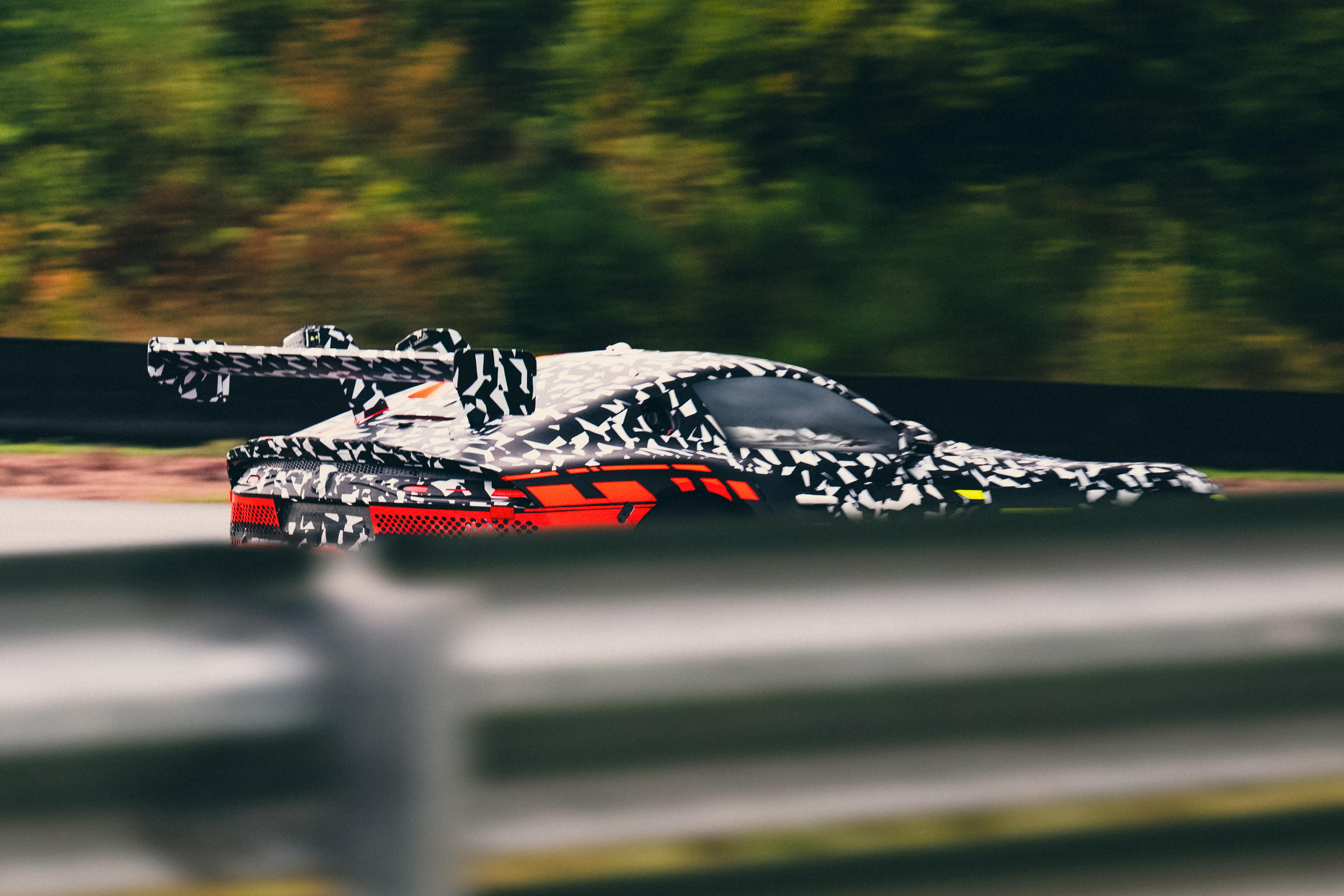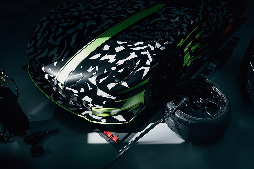 Other than the big wing, few details can be seen in these arty teaser shots, thanks in part to full-body camouflage tape with red and yellow accents.