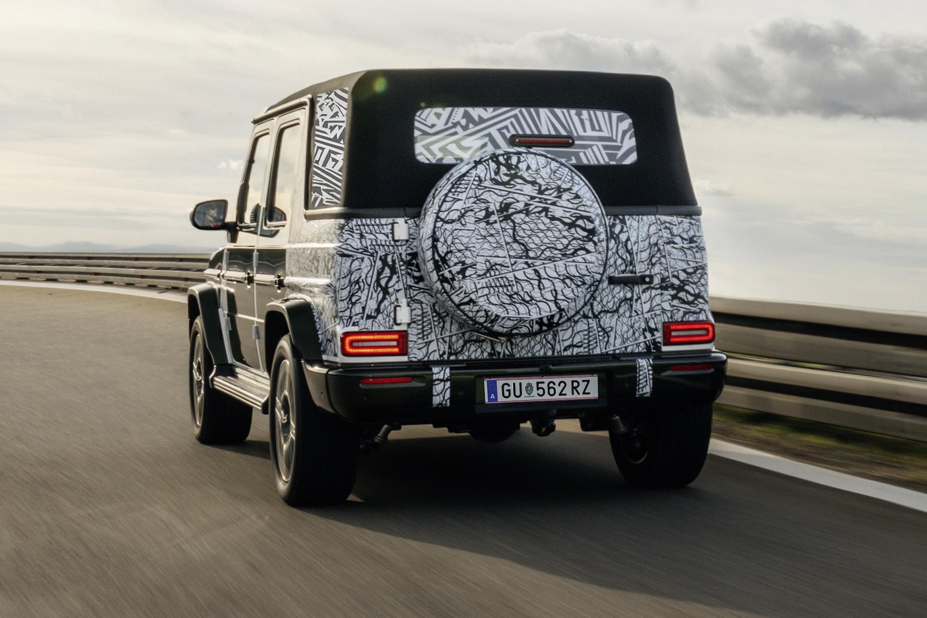 The presence of a spare wheel on the tailgate and visible rear axle indicates the cabriolet being tested has an internal combustion engine (ICE), rather than the electric G580 EQ’s four-motor layout.