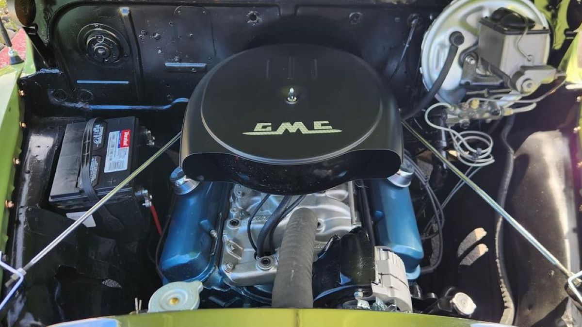 Under the hood is a 350ci small-block V8 mated to a rebuilt Turbo-Hydramatic automatic transmission. The listing says that the truck “needs alignment but runs good.” The odometer reads about 27,000 miles, but true mileage on the chassis is unknown.