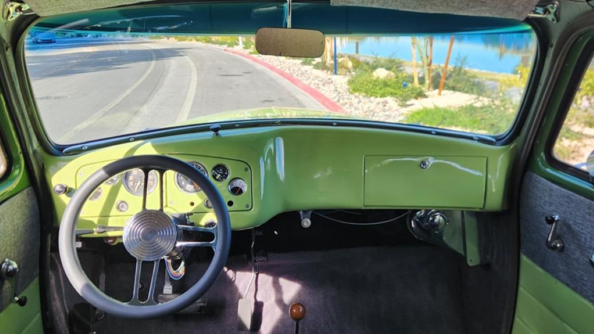 “Great condition for its age,” the listing says. The eye-catching two-tone green finish is relatively fresh, since the seller says it was repainted within the last “handful of years.” Exterior features include a chrome grille, chrome bumpers, fender trim, windshield visor, dual side mirrors, running boards, and period-correct whitewall tires.
