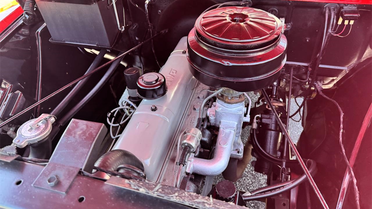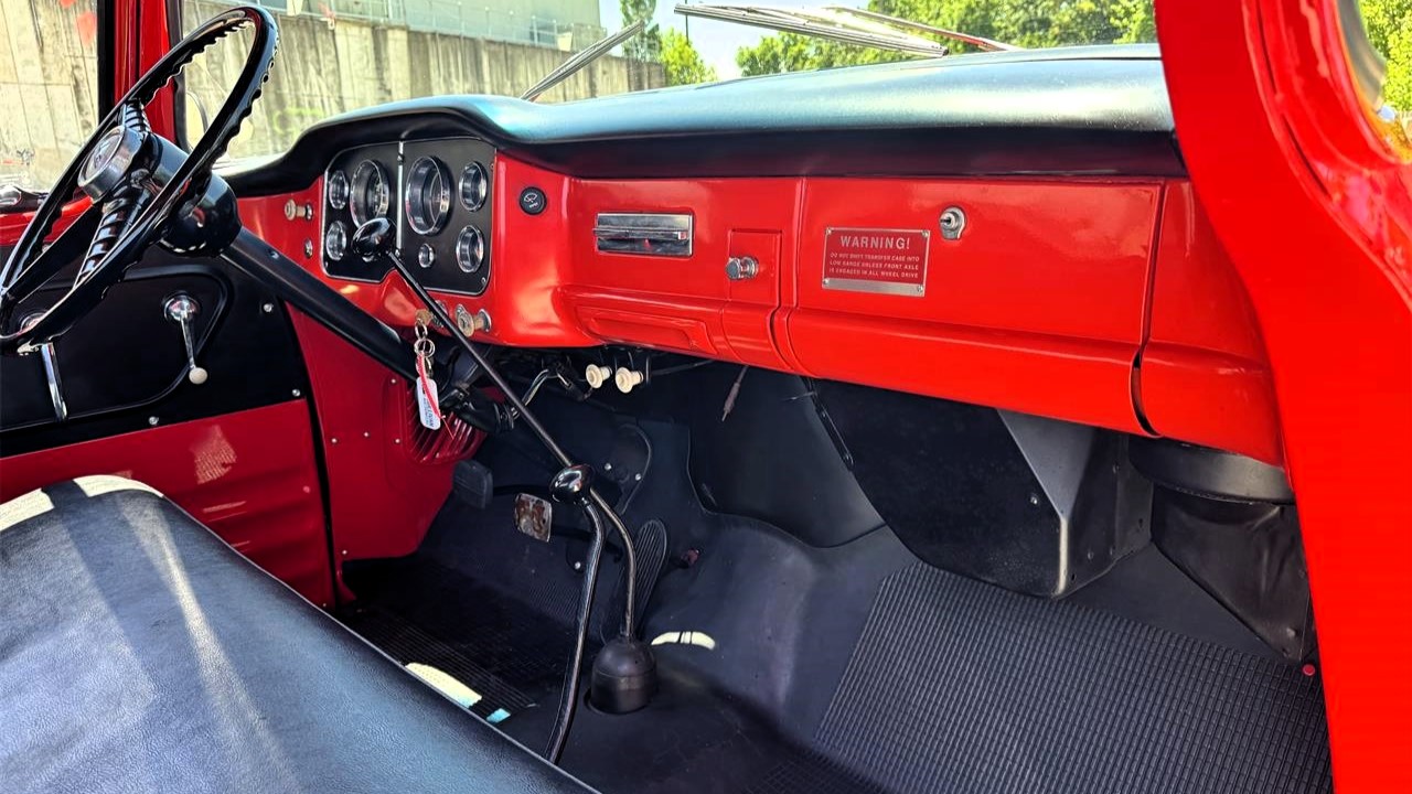 NAPCO trucks were built for demanding work and rough conditions, so they were typically beaten up on a daily basis—which isn’t conducive to a long life. Luckily, someone restored this 1956 Blue Chip truck, refinishing it in the charming combination of red with a white roof and white B-pillars/rear window surround as well as white bumpers. There are five white 16-inch wheels, including an external spare mounted on the driver side. Putting the spare on the outside of the bed not only makes this truck look cooler, but it also leaves more space to carry stuff on the bed’s tan wood planks.