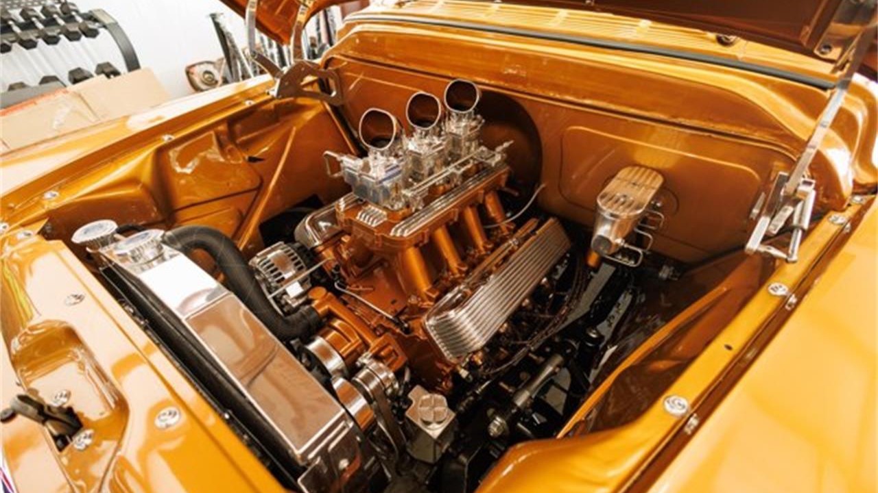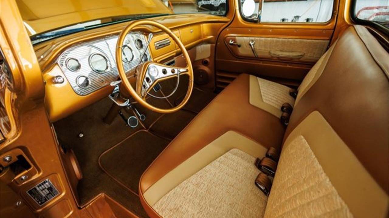 True to its name, Old Gold has more of the rich color inside the cab, including the custom dashboard that is decorated with a set of Dakota Digital gauges and an Impala two-spoke steering wheel. The Glide Engineering bench seat is upholstered in a tri-tone color scheme that coordinates and contrasts at the same time. A Vintage Air A/C system keeps everyone as cool as this truck looks.