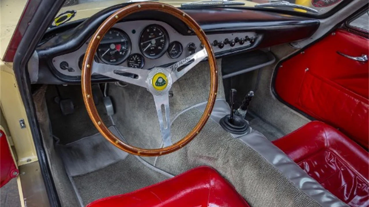 The seller describes this Elite as a left-hand-drive example finished in its factory color of Lotus Yellow over a red interior. To add to its exclusivity (Lotus built between 1,030 and 1,045 total cars), this Type 14 features the signature of the famous race car driver David Hobbs on the steering wheel.