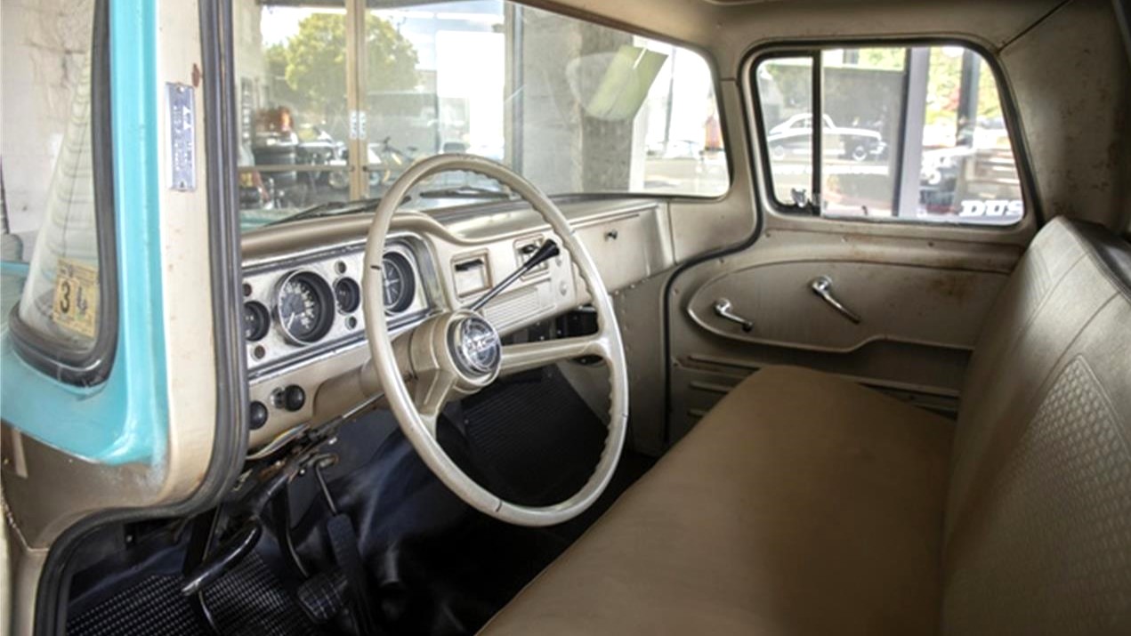 Aside from those updates, this truck has been left alone. The turquoise paint was laid down in the GMC factory back in the day, and the beige vinyl interior is the same one this 1000 had when it rolled off the assembly line. Both have aged well, probably because the previous owner(s) put only 60,085 miles on the odometer.